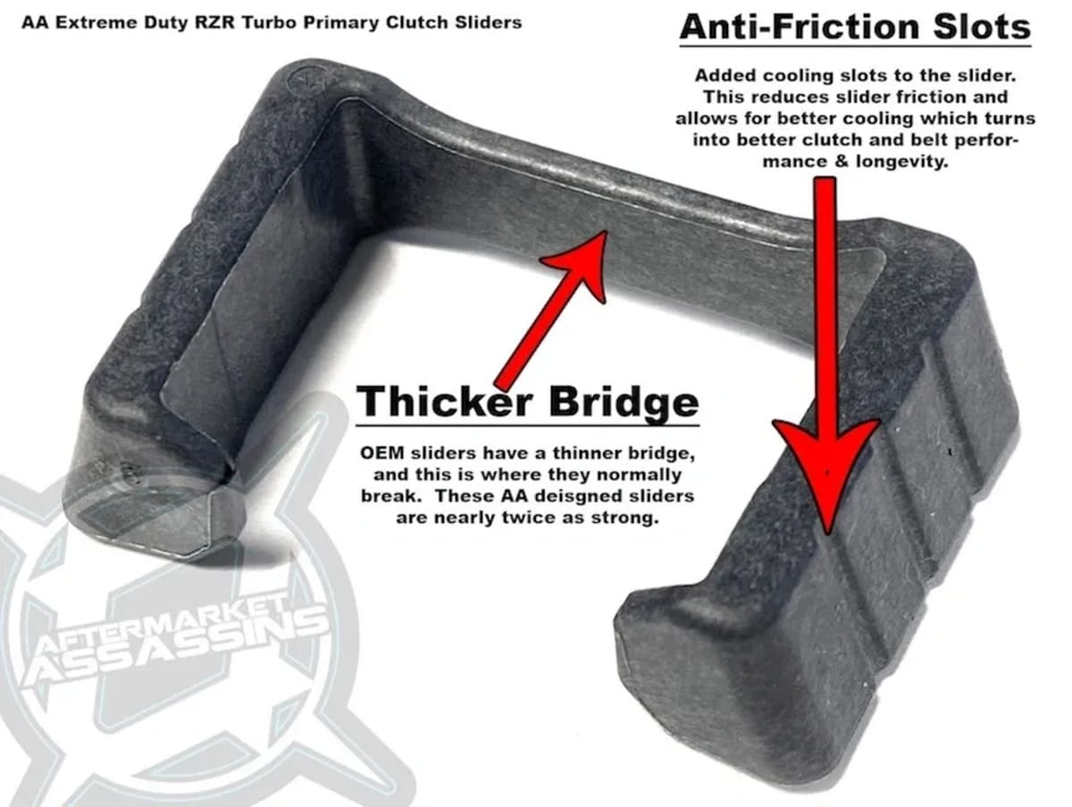 This kit includes our complete heavy duty AA primary clutch. This clutch is the same design found on the 2016-2020 RZR Turbo models with an encapsulated tower design. We found this clutch to hold power better, hold up better (no exploding), and slip the belt less. It simply meets the demands of these high horsepower vehicles, and is proven. This clutch also holds belt grip better than billet clutches, especially when clutching for higher RPM. This primary clutch is our own version made with higher grade tool steel for the post, assembled with AA HD sliders, to our AA specifications. Now includes our billet Revolver Clutch Cover with Tower Lock for increased strength and airflow!