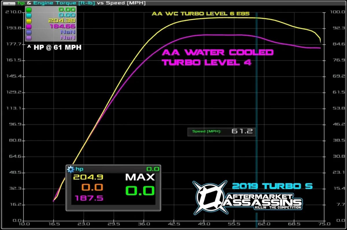 The Level 2: Turbo upgrade tune is a very safe 16-17 PSI 91 octane tune, good to run on any 91 oxy/ethanol. This tune produces 155-160 RWHP peak (calculated 195 crank HP), but will pull much harder and keep that horsepower maintained much better than the stock turbo.