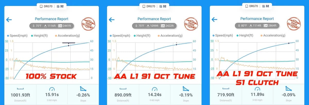 Acceleration graphs were done using the Dragy device and phone application. Test were done as consistently as possible. We are very picky and honest with our results. We take the average of runs, not the worst stock vs. the best AA run.