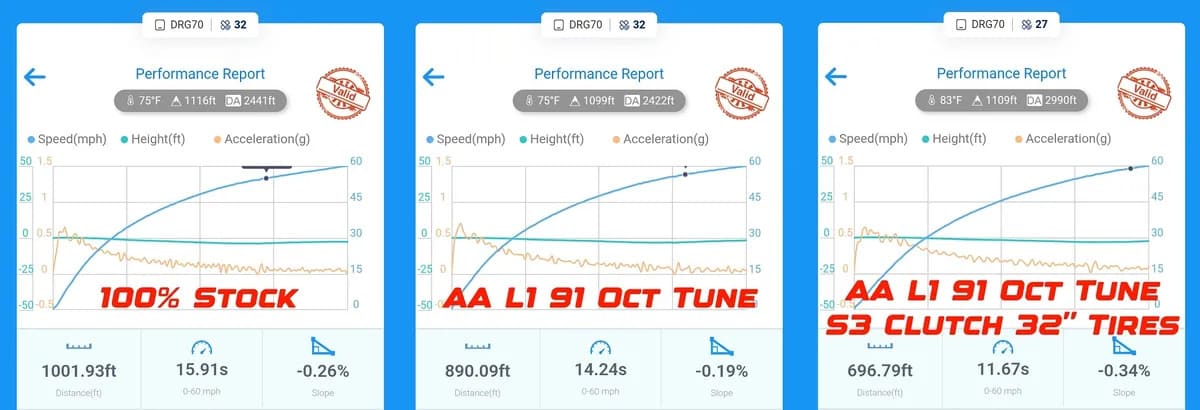 4 seconds faster (+20-22 RWHP) than stock when testing 0-60 MPH with the tune and AA S1 clutch kit. AA S3 clutch kit is an additional 2.5 seconds faster over the tune with larger 32" tires installed.