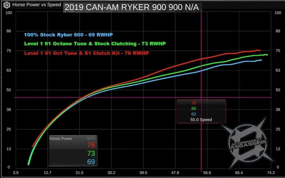 - If you are looking for the most badass custom tunes that are easily loaded to your Ryker 900 from the Dynojet Powervision, you've found them! AA's performance tunes are offered loaded directly on the Powervision ECU tuner. This versatile tuner allows our tunes to easily be uploaded to your factory ECU, switch between tunes, and even return to stock. The PV is also a great gauge showing engine parameters such as timing and much more. You can leave the Powervision hooked up for gauges or completely remove it after flashing your ECU. The Powervision also has excellent data logging capabilities if you download the software and use your laptop. You can even view trouble codes and erase them on the fly. We are highly experienced in ECU tuning and it shows. Our tunes are simply set up correctly and everyone with a Powervision should have these tunes! They are also easily labeled and will show horsepower gains with supporting mods such as exhaust and clutching. These tunes modify all the necessary maps to create big horsepower while still maintaining a reliable and safe Ryker 900. Each tune is built specifically for your Powervision allowing us to change various things like rev limit or fan temp if needed.