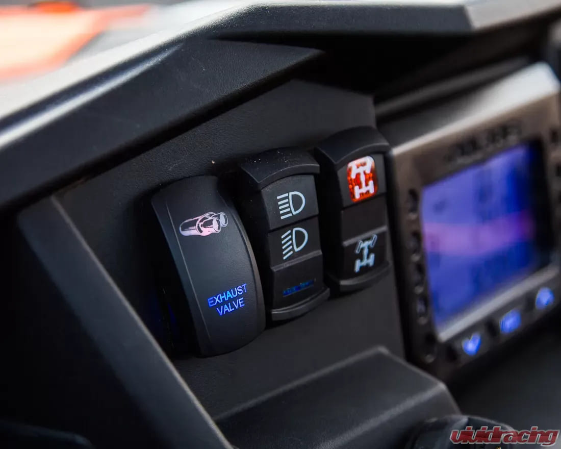 The Agency Power valvetronic exhaust is constructed of T304 stainless steel that has been hand TIG welded to perfection. The exhaust mounts directly to the turbo pipe with a thick 3 bolt flange. A beautiful merge splits between the chambered muffler and the exhaust valve. The muffler was spec’d to provide a sporty tone when the valve is closed. Exiting each side of the muffler is a straight cut 2.50 inch turn down exhaust tip with holes to install a spark arrestor. With 2 tips, you can reuse your existing spark arrestor and optionally purchase 1 or 2 from us as needed.The exhaust feature an electronically operated valve similar to those found on super cars. This is operated by the included switch that can easily be mounted in your dash or center console.