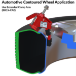 Certain cast aluminum and alloy passenger vehicle rims have a profile that prevents the tool from clamping properly (see illustration). For Automotive wheels with curved/angled surfaces, the accessory Extended Clamp Arm (BB1X-CAE) is needed for proper clamping with those problematic wheels.