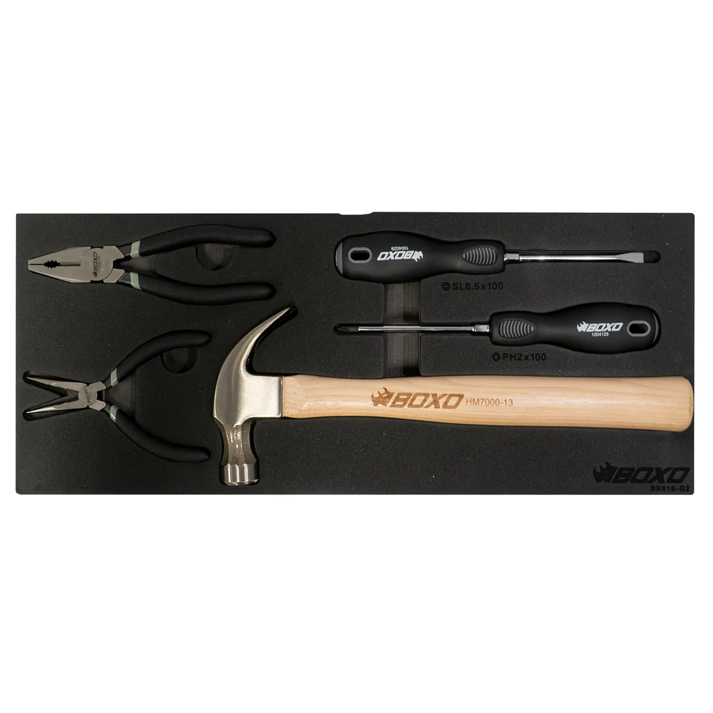 New to the BoxoUSA line of toolboxes is the 2-Drawer Hand Carry Tool Box with tools! This 2-Drawer Hand Carry comes loaded with a 113-Piece metric tool set; all professional grade craftsmanship with black handles and grey Boxo labeling are organized in a matte black EVA foam tool storage solution tray to keep your tools organized and looking neat. Designed as a grab-and-go hand-carry solution with all the essential tools you’ll need for many jobs at an affordable price.