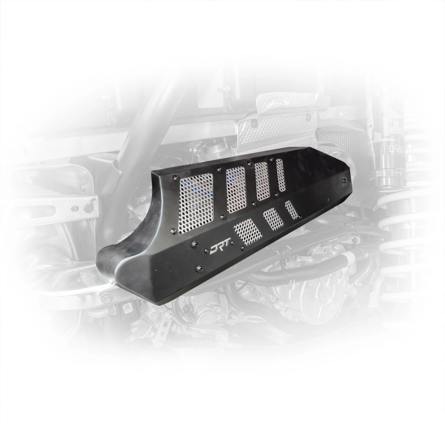 DRT Motorsports Polaris Turbo Aluminum Headpipe Shield improves the look of the unsightly OEM turbo head pipe. Made of formed and welded 6061-T6 Aluminum, with raw aluminum mesh for contrast and signature DRT logo plate.