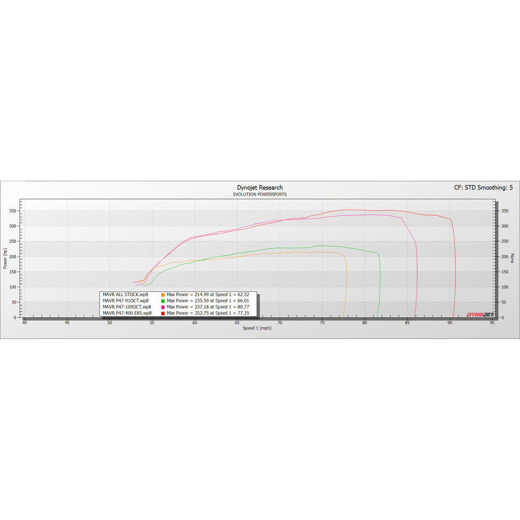 Unlike the X3 turbocharger, the Maverick R is already a ball-bearing CHRA. When we measured the wheels on the OEM turbocharger, we saw that the OEM turbine size was adequate to flow much more than was possible with the stock compressor wheel. After testing a number of compressor profiles, we found that a compressor wheel with a 46.5 inducer was best suited to the engine characteristics. Spool time is almost identical to stock with a top end that does not quit. You can see from the Dyno graph how the power comes on very close to the stock turbo, but then skyrockets once we get into the meat of the power band of the engine. The tuning that will be released initially is approximately 355 WHP, as measured on our Dynojet 224 LCX. Our Mainline dyno reads approximately 2-3% higher than the Dynojet, so dyno numbers will be 365 hub HP if measured on the hub dyno. Even though more power is available than we are releasing the kit with, the testing we have done at this power level has proven to be reliable for the engine and transmission. As we get more data at higher power levels, additional tunes may be available. For customers that already have our Maverick R E85 setup, the only additional components that are needed are as follows: EVP Injectors, EVP Plenum Clamp, EVP HFI Intake, EVP 4 Bar Map Sensors. In addition, all Maverick R P47 Turbo Upgrades will include transmission tuning with launch control as an option.