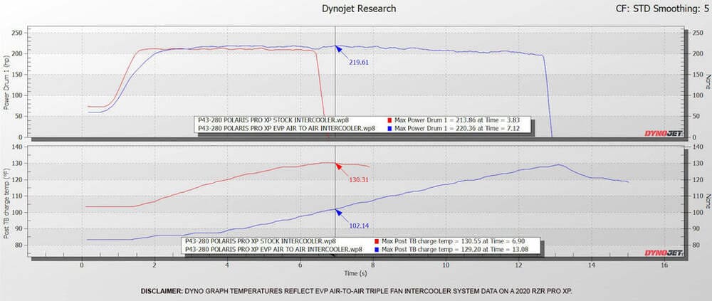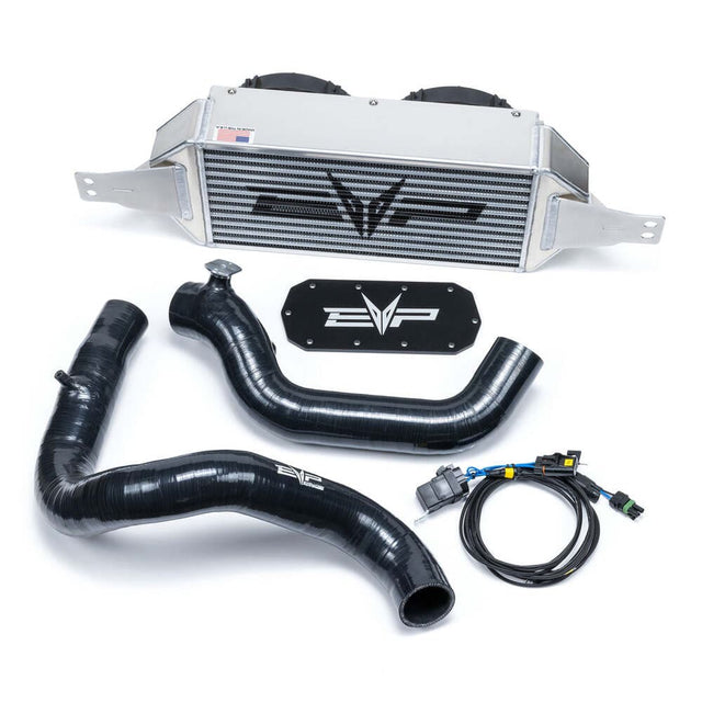 The EVP Air-to-Air Dual-Fan Intercooler for XPT/S models is made in the U.S.A. and built to withstand incredibly high temperature and pressure levels to effectively cool and regulate airflow to the engine. Through testing and development, this air-to-air setup consistently Reduced intake temperatures on Paragon-equipped RZR's compared to tuned RZR's with the OEM water-to-air unit, despite the big turbo systems providing 10 more pounds of boost and 60+ more HP. The EVP Air-to-Air Intercooler setup also helps enhance ignition settings in addition to improving airflow efficiency, allowing the engine to make more power with improved performance without breaking down vital components. This is an absolute game-changer for anyone looking to make safe, reliable big power numbers with their RZR.