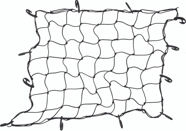 Adjustable rach net has 6 removable plastic hooks with a new tightening feature. To tighten, pull inner cord over additional hook.