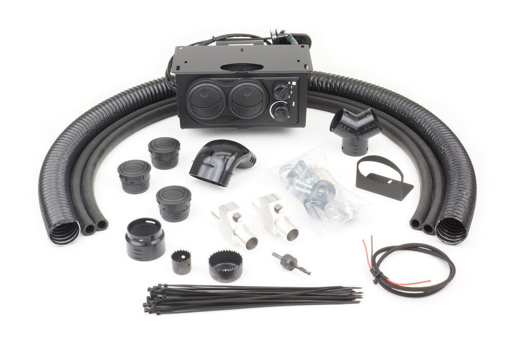 This is an outstanding Universal Heater Kit for the Do-It-Yourselfer out there. Use your cooling system to heat your cab! The heater kit includes a Three speed fan and temperature adjustment knob on the front of the 14,600 BTU heater unit. Two forward facing, 360 degree adjustable louvers direct the heat were you need it. The Heater unit includes an outlet port that connects defrost duct hose to a set of rotating vents that can be mounted in the vehicle dash. One additional rotating vent directs heat toward the footwell area. The kit is complete with a powder coated universal mounting bracket which can attach via the 4 slotted mounting points, 6ft of 5/8'' premium heater hose, built in shut off valve, stainless steel hose clamps, two machined aluminum Y fittings , duct hoses, hardware, wiring, hole saw, and instructions.