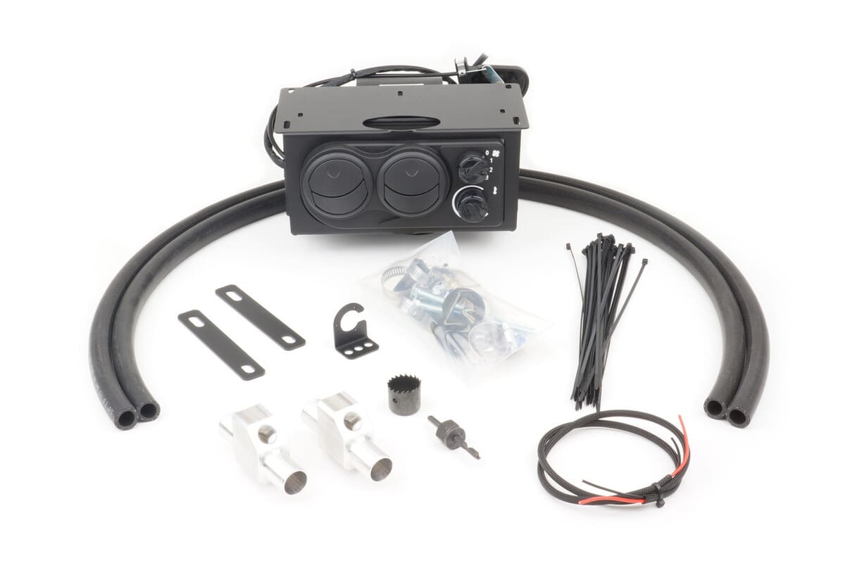 Use your cooling system to heat your cab! Three speed fan and temperature adjustment right on the 14,600 BTU heater unit. Two 360 adjustable front louvers directs the heat were you need it. Mounts under the dash which leaves plenty of room for your feet. Comes with templates, mounting brackets, hoses, custom Y fittings, built in shut off valve, clamps, hardware, wiring, hole saw, instructions, and more.