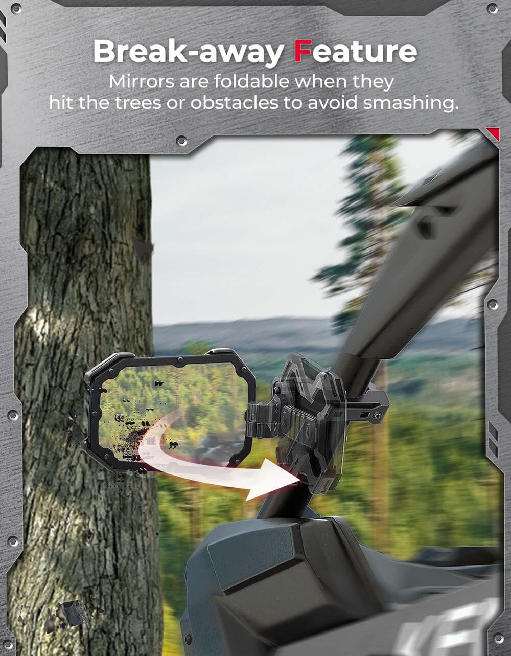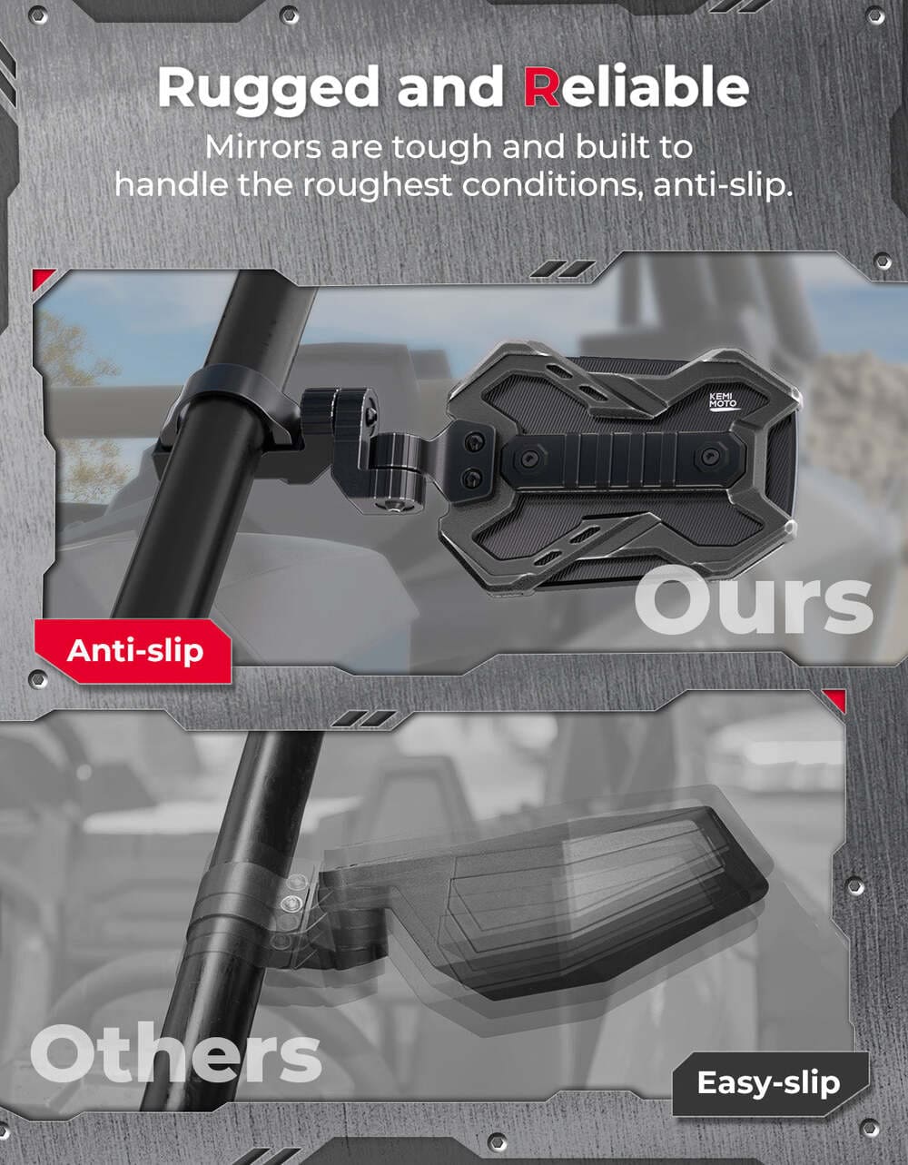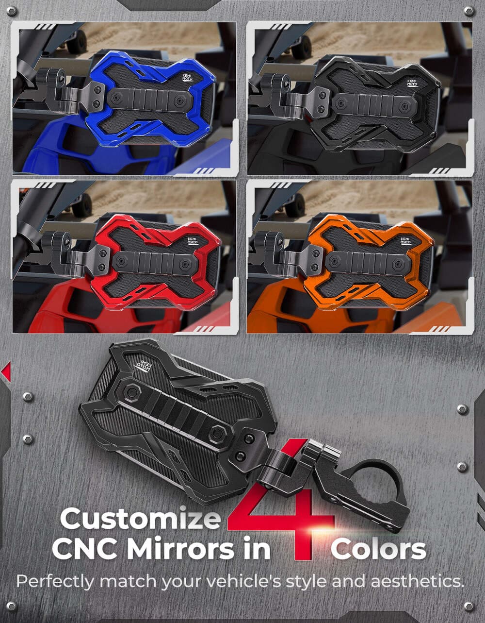 DIY your UTV with KEMIMOTO CNC Side Mirrors for enhanced visibility and safety. Featuring a double-layer anti-collision structure, they resist impact and offer 360-degree rotation for the perfect view. Larger than standard mirrors, they provide an expansive field of vision and are made with shatter-resistant glass to minimize injury risk.