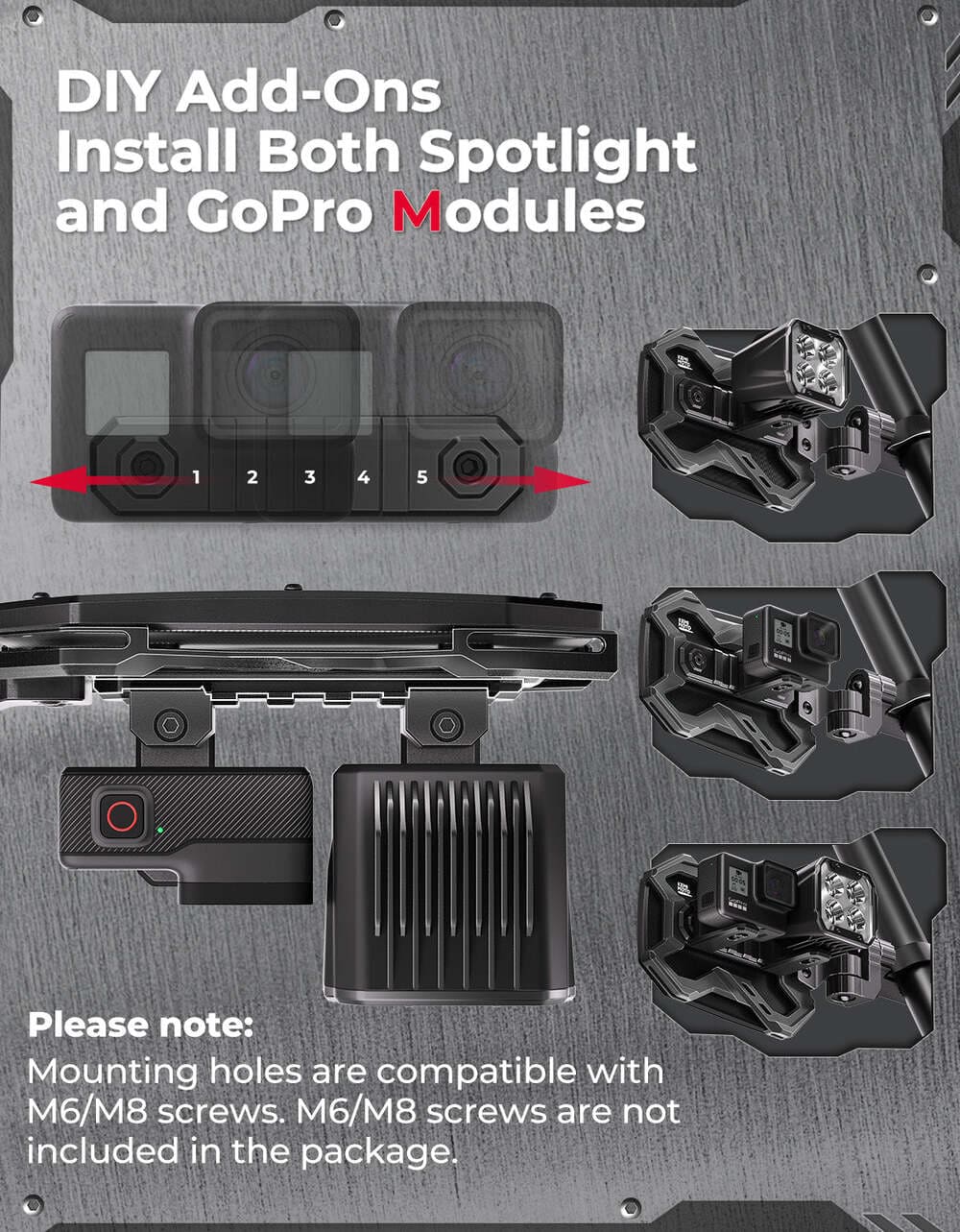 Slide Design for Versatile Installation: The innovative sliding track light mount design offers flexible installation options. It allows you to easily adjust and choose the mounting position for work lights, enabling the installation of two work lights or other devices like a GoPro.
