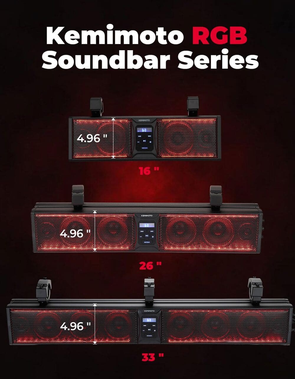 - 6 Speakers & 2 Tweeters: Are you looking for a UTV soundbar you can hear on your ride? Kemimoto sxs sound bar RGB is your best choice. With 6 full-range speakers and 2 tweeters, a built-in class A/B amplifier, this powerful soundbar gives you immersive stereo sound at high speed on the road.