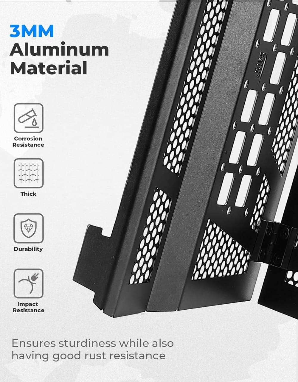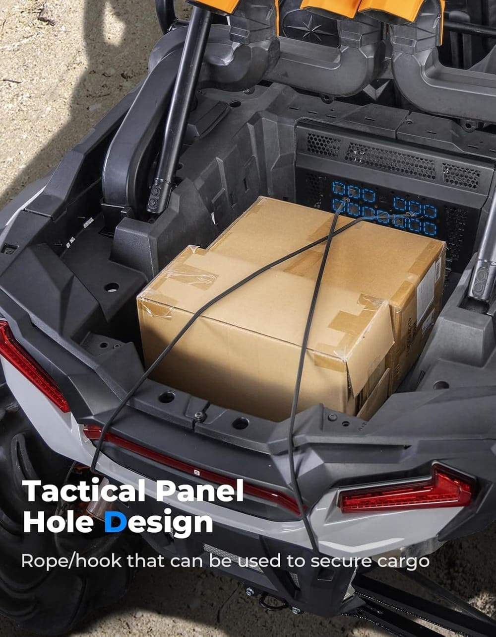 - Tactical Panel Hole Design: The vertical surface has two rows of holes that you can use to attach ropes or hooks for securing cargo. The two covers are connected with hinges, so you don’t have to lift the whole cover when you open them, unlike factory models.