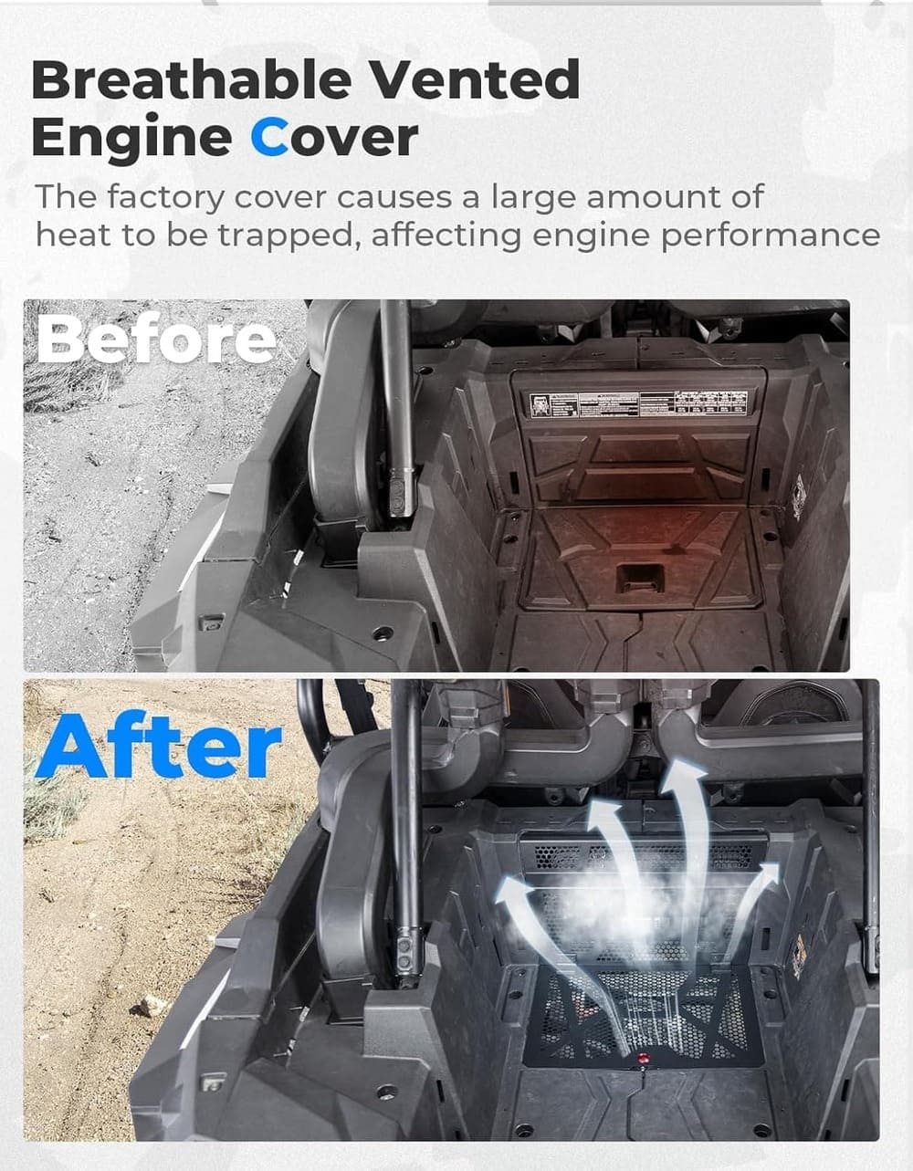 Keep your engine cool and ride unstoppable with the Polaris RZR XP Vented Engine Cover. Crafted from rugged 3mm aluminum, it resists rust and meets the harshest off-road conditions. The precision-cut vents enhance airflow, helping to prevent overheating and boosting overall engine efficiency. With a built-in quick-access switch and tactical panel holes, routine maintenance is faster and easier than ever!