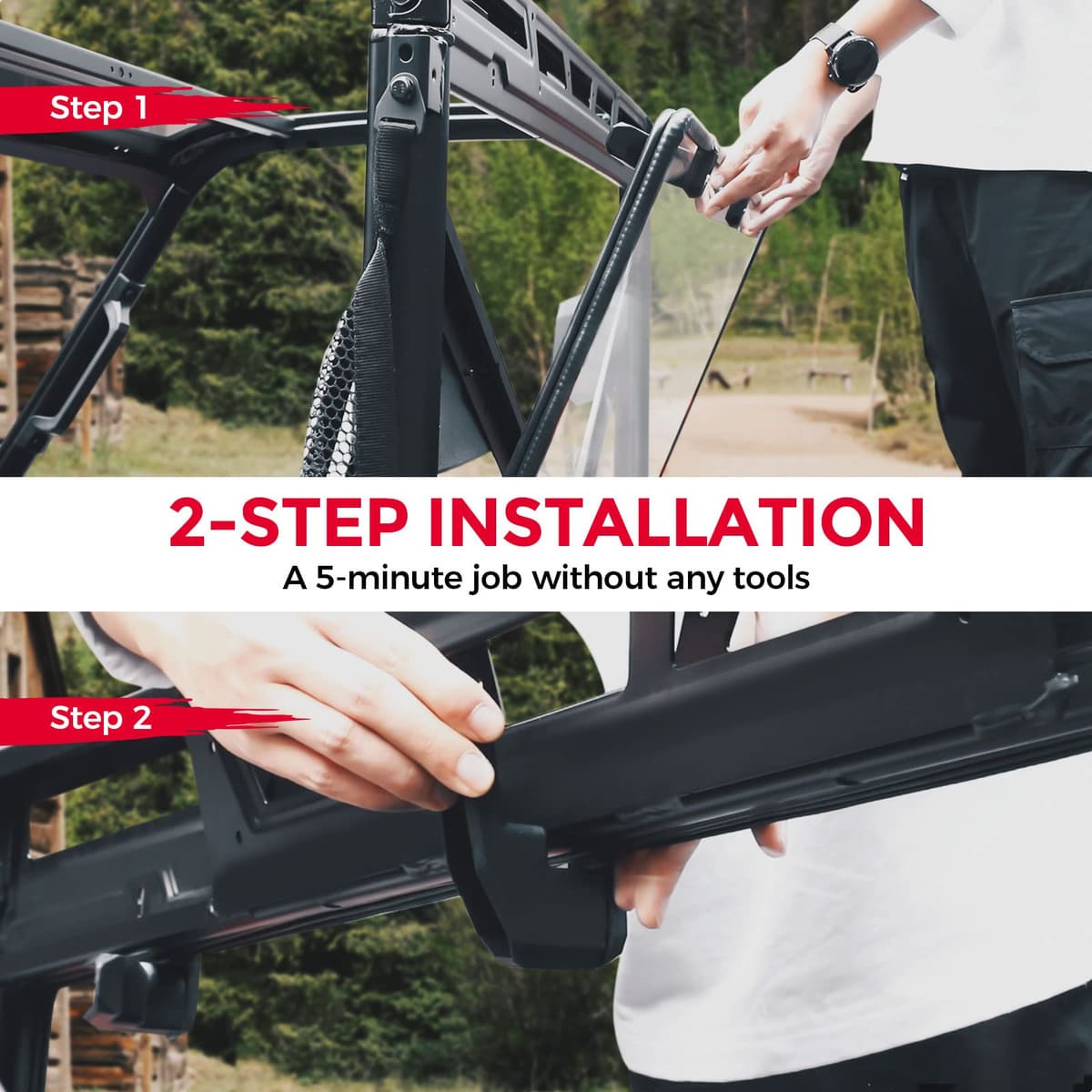 - 2-Step Installation & Removal: Tool free, no drilling required. Comes with pre-installed rubber strips. No need to install that by yourself with pain. Place the back windshield in the right place, and rotate the clamps to fix it. Stable and sturdy. (The installation video on this page will show you the 2-step installation.)