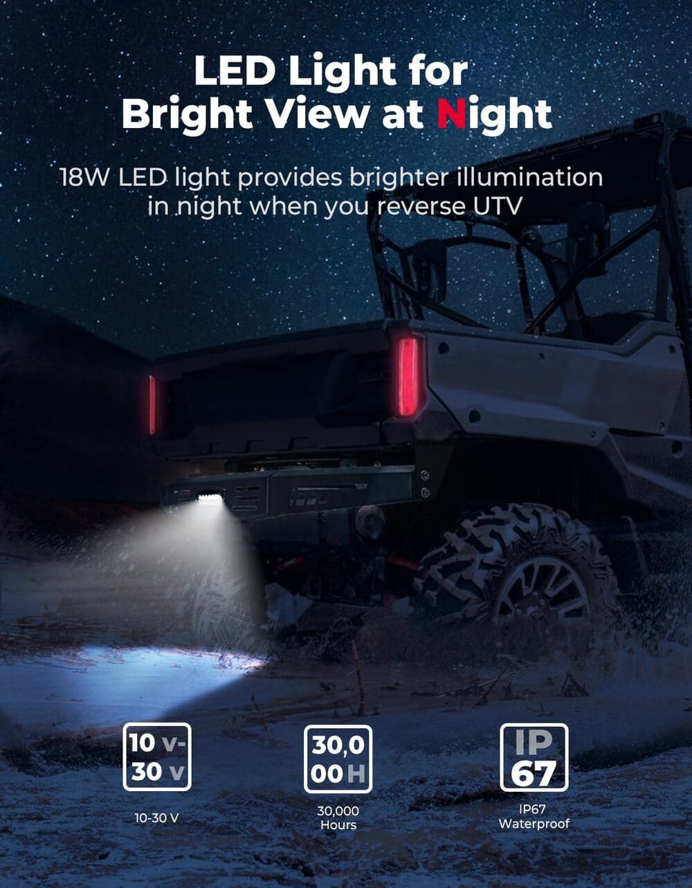 Enhanced Visibility with LED Light: UTV rear protector comes with an 18W LED light, providing improved visibility and safety during nocturnal rides. It lights up the trail behind you when reversing and makes sure you're seen by other drivers. Built to be IP67 waterproof and boasting a lifespan of over 30,000 hours, this LED light is durable and suitable for all weather conditions.