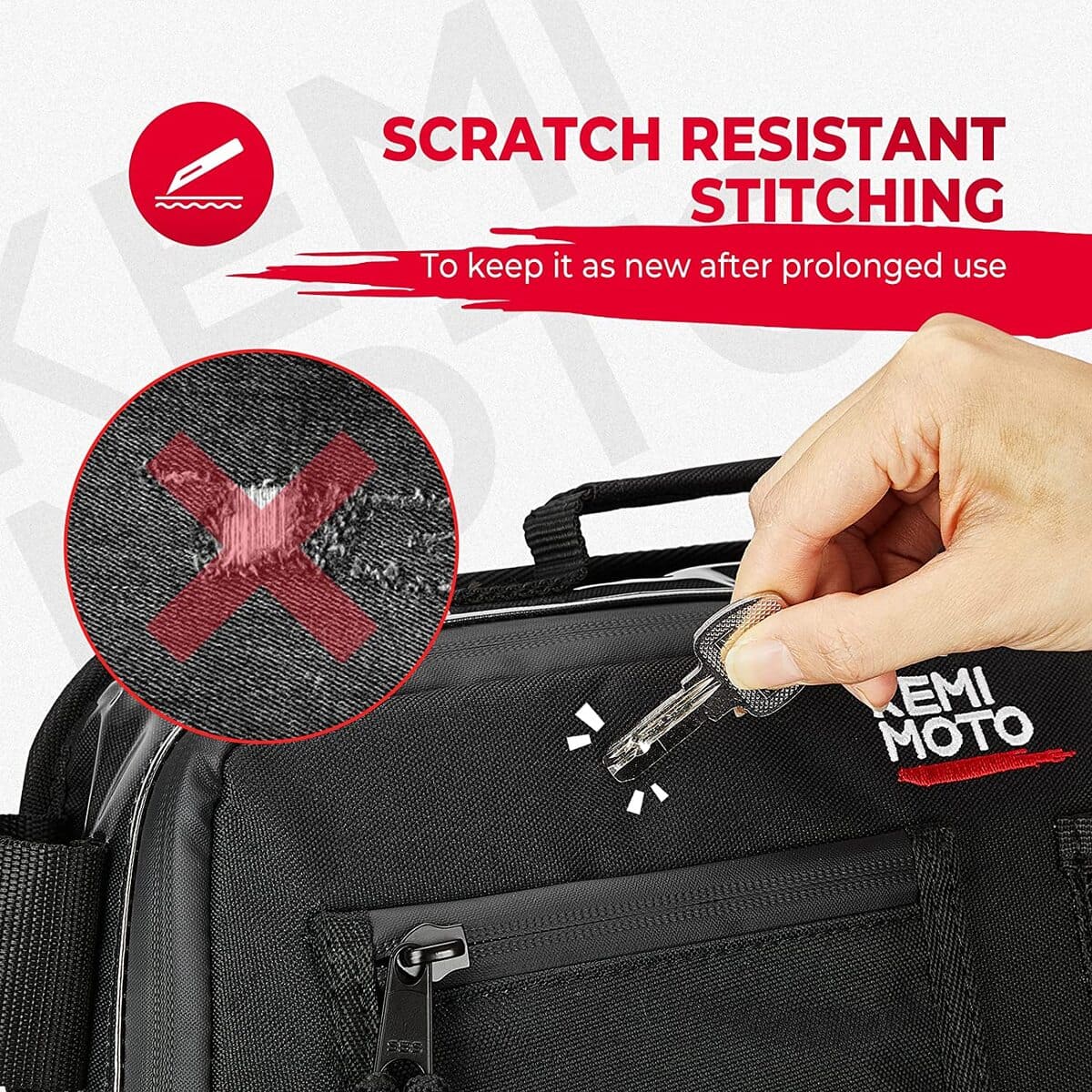 Kemimoto x3 overhead bag is made of 1680D nylon fabric that is anti-scratch, water repellent and high load bearing, it is designed with several small bags, which allows you to store your tools, phone, key, etc. separately.