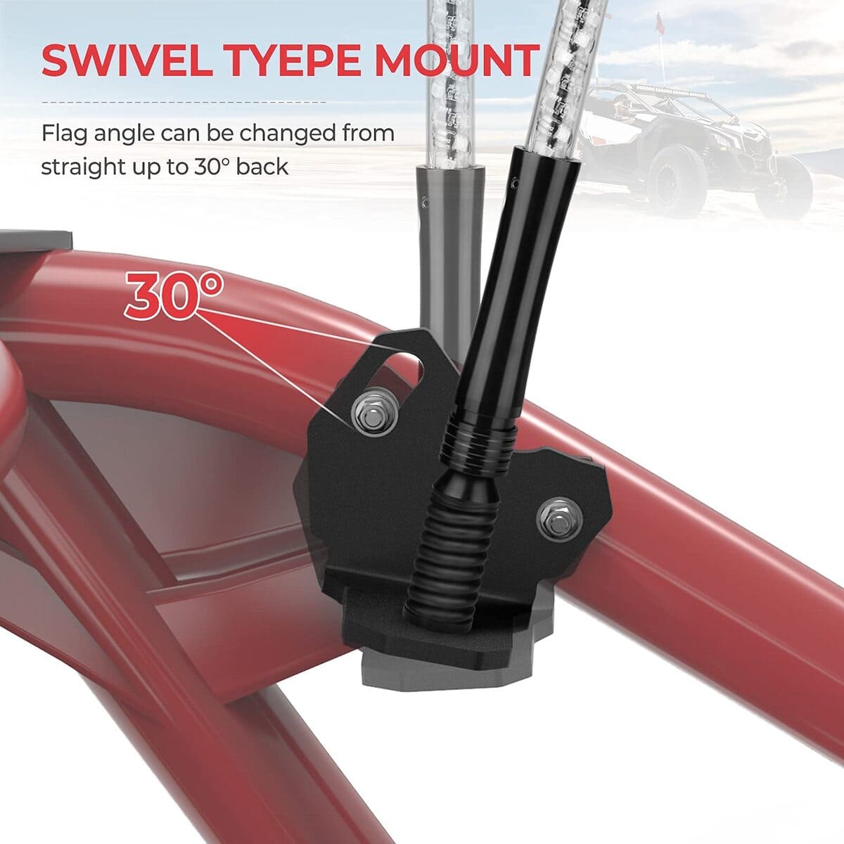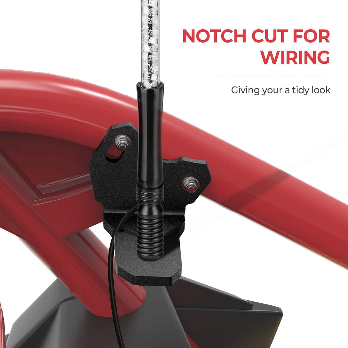 Adjustable: kemimoto whip lights X3 Mounting Bracket has a 30° adjustable mounting angle for you to adjust the whip light to stand straight up or with a nice slant. And the notch cut design is for a tidy while wiring the wire.