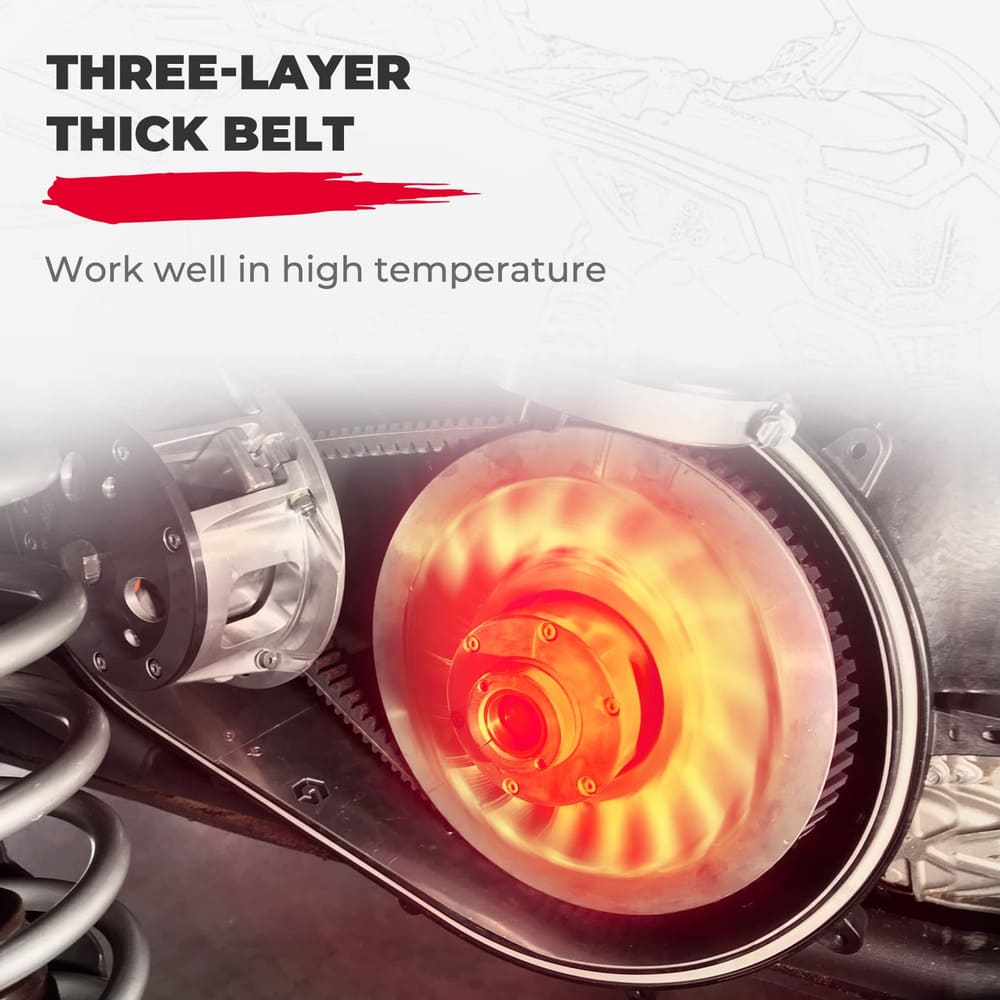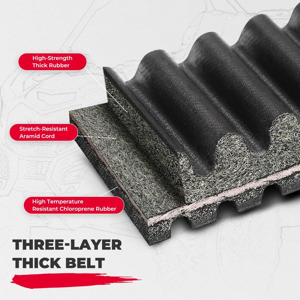 - High-quality Material: The kemimoto x3 belt is made of high-quality neoprene (Chloroprene rubber) and advanced polyester cord, which own the feature of high-temperature resistance, fire retardant, lightweight, high strength, stable size, puncture resistance, wear resistance, chemical corrosion resistance, good mechanical properties.