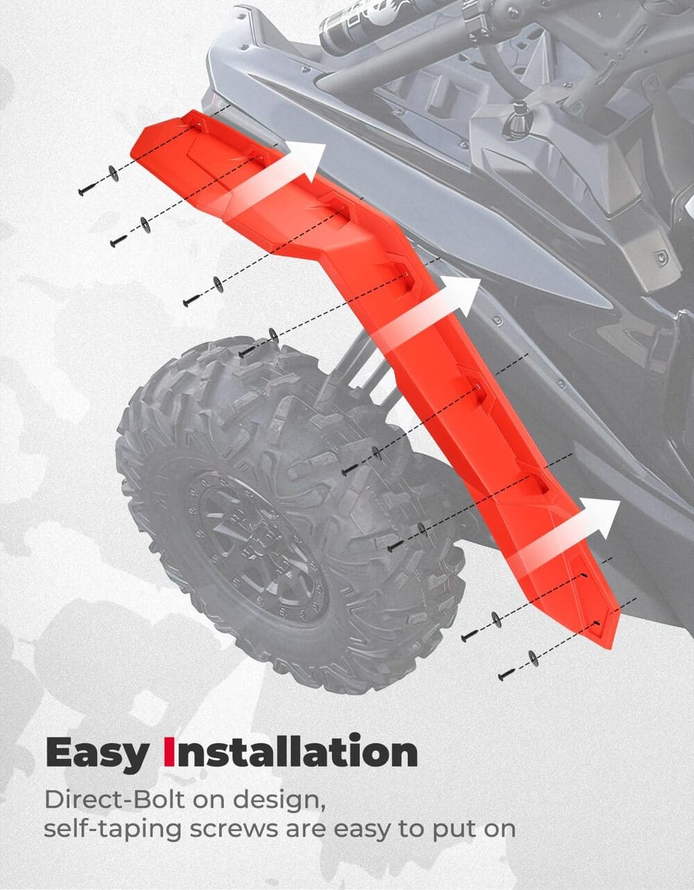 Easy Installation: Kemimoto x3 flares contains all necessary self-taping screws and installation instruction, they are pre-drilled and adopt direct bolt-on design, drilling small pilot holes will help to finish installation quickier on your own. And they can work with x3 fender flares extensions.