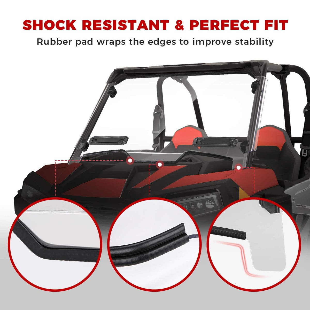 Tight connection & shock-resistant: This full RZR 1000 windshield for is accurately made according to UTV frames, thickened bottom rubber strips ensure tight connection with engine cover and does not scratch or damage the hood, preventing dust and water leakage.