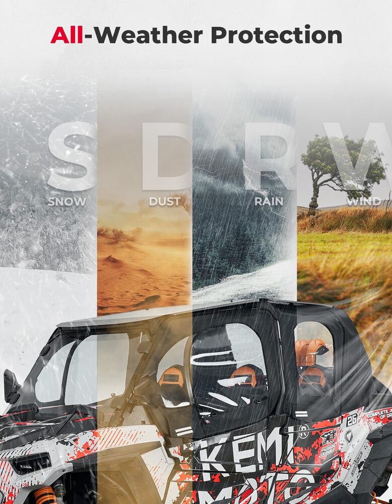 - Rolling Windows Design: The KEMIMOTO cab enclosure protects from sand, dust, and rain in summer, and wind, snow, and cold in winter. It has a roll-up transparent film for ventilation and a soft upper door with zipper pullers on both sides for easy access. Pull the zipper up to the top of the other side, and you can open the door to get on/off.
