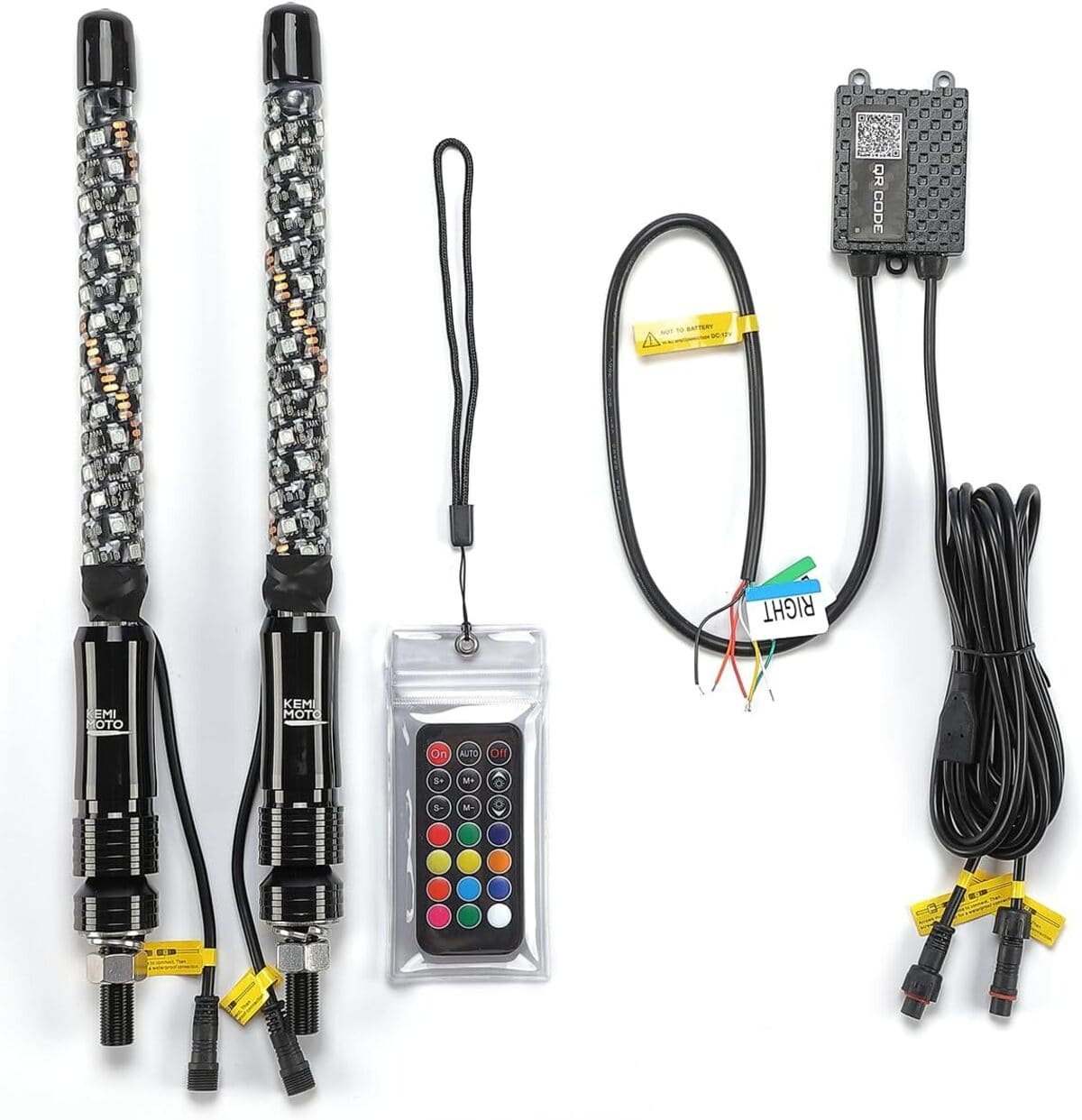 Turning signal & Brake light: KEMIMOTO Bluetooth-controlled led whip lights for utv can be connected to taillights and turn signals for brake light and turn signal functions. Please refer to the manual for specific wiring connections.