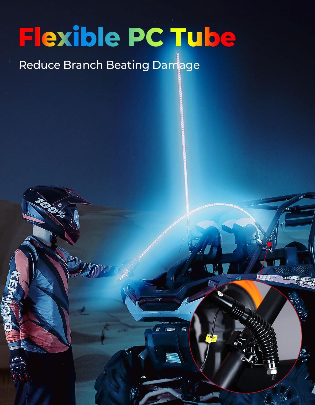 - Cool & Bright: Kemimoto Whip Lights have 336 5050 SMD RBG LEDs, can play in 22 dynamic modes, 21 static colors, 5 brightness levels, 10 Speeds, 256 PWW levels, could be seen even during the day, mile away.