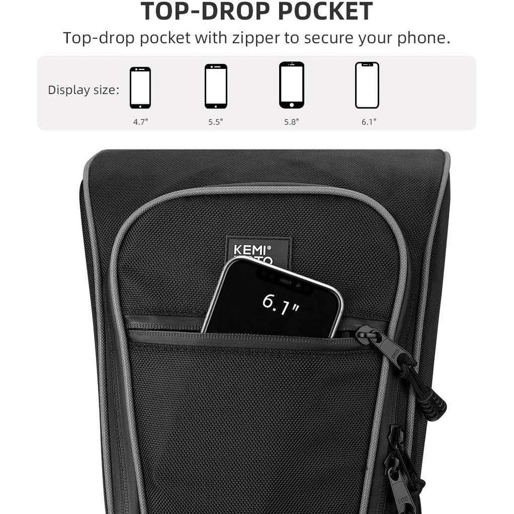 Top-Drop Pocket: Top-drop pocket with zipper to secure your phone and keep it within easy reach.