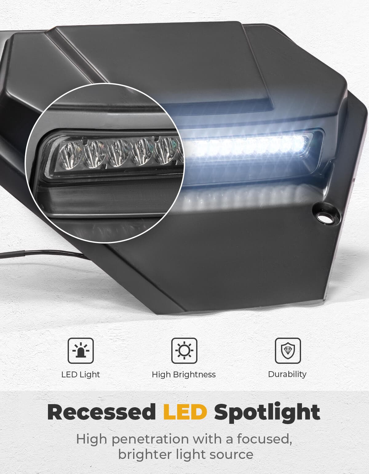 - Illuminate Your Path: This front cover is equipped with LED lights, offering a brightness of up to 2500 lumens to meet your intense lighting needs. It illuminates trails at dusk and night, ensuring a safe driving journey for you.