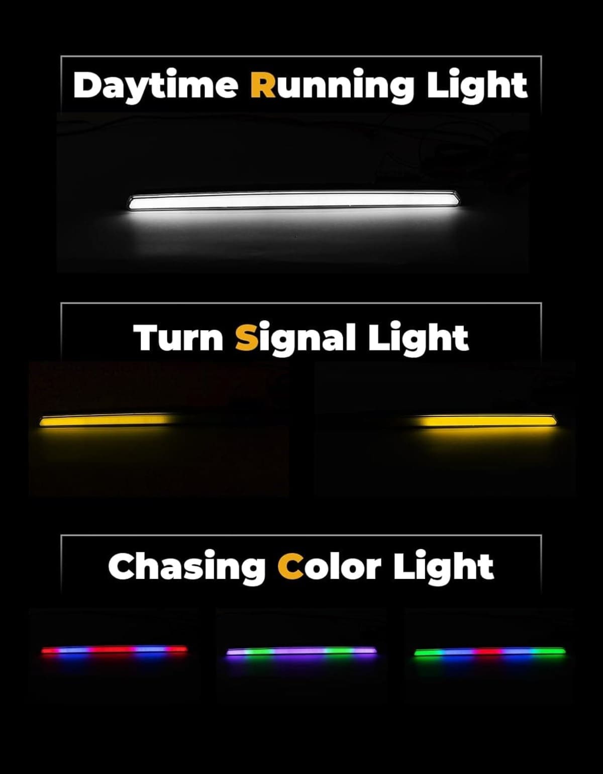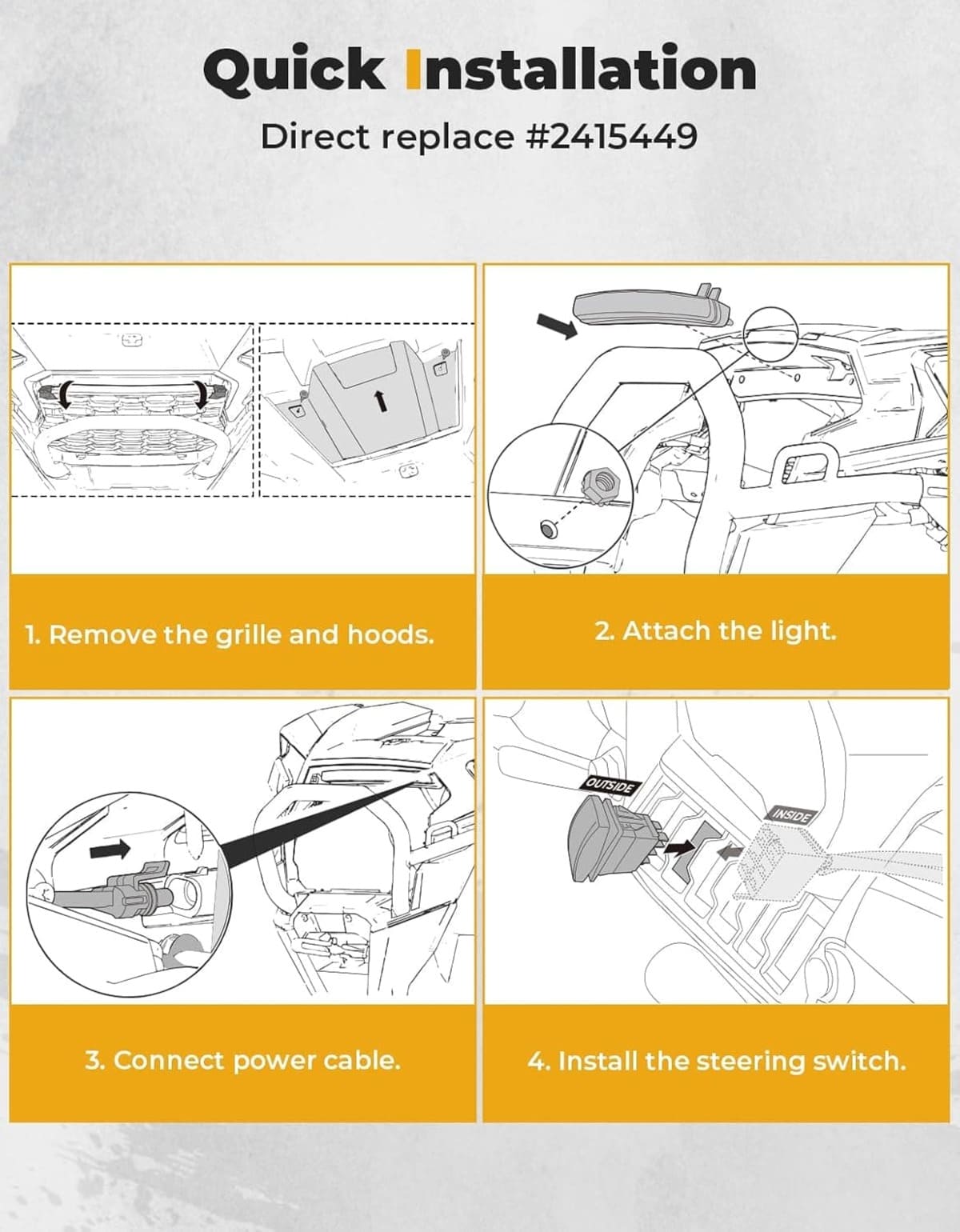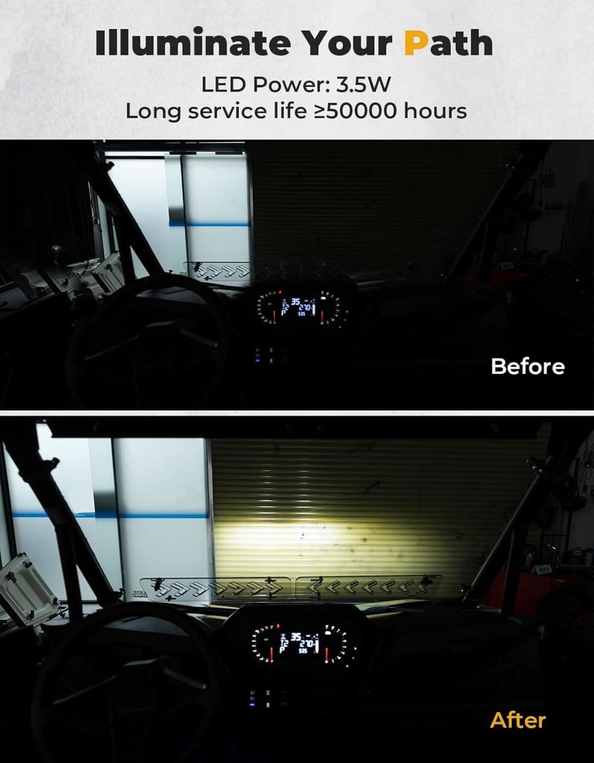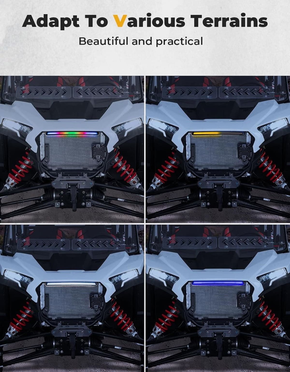 Multiple Lighting Modes: Professionally designed to offer a variety of light color options, catering to different users' aesthetic preferences. This UTV front light can function as a daytime running light with white, a turn signal light with yellow, and an ambient light displaying multiple colors.