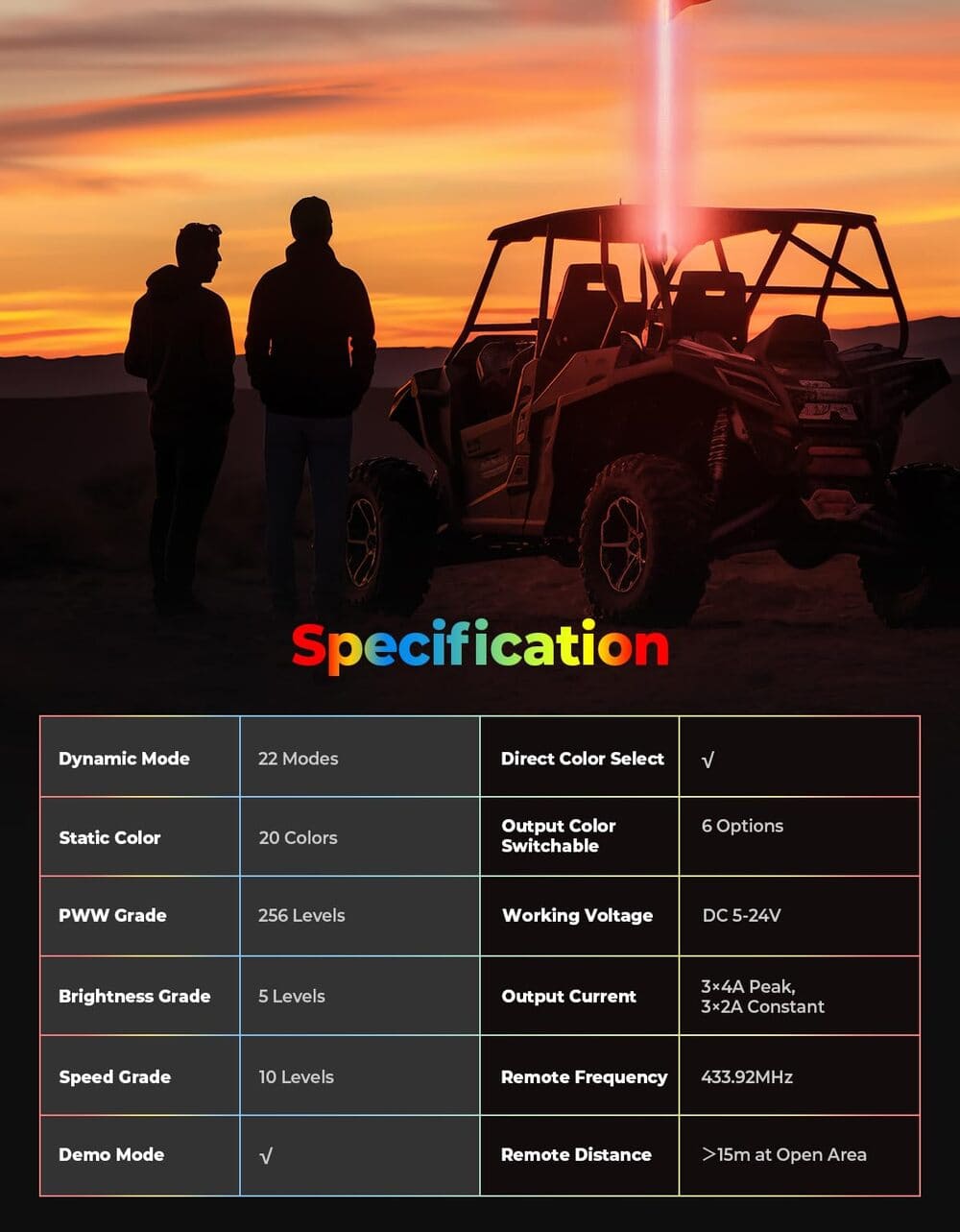 - 1-to-1 Wireless Control: The RF wireless remote signal can pass through barriers, and the remote distance at open area is up to 15m, you can freely adjust Antenna Light to different modes, colors, speeds, brightness levels.