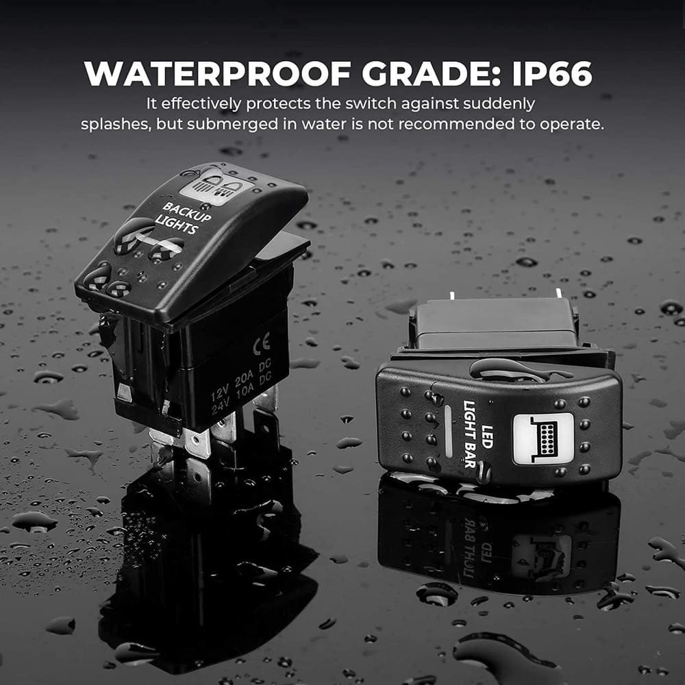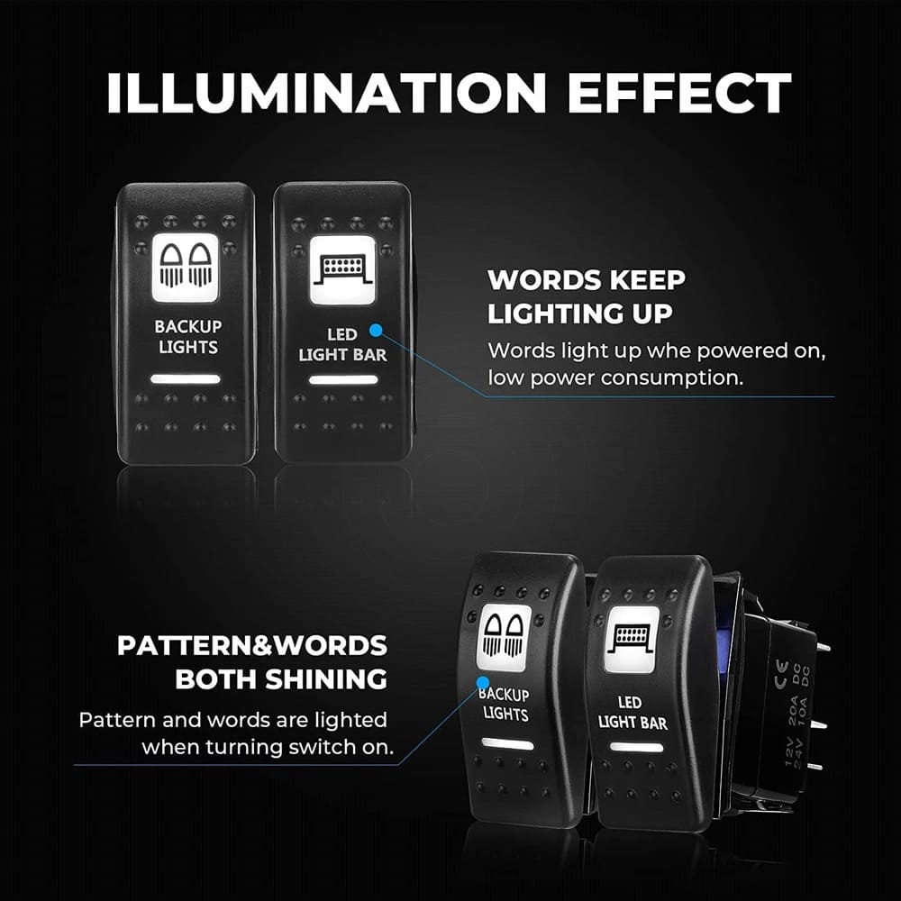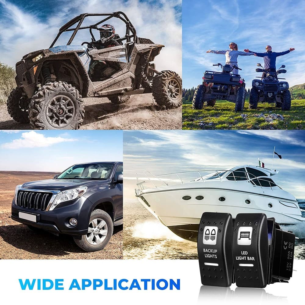 Easy Installtion: 5pin on-off toggle rocker switch is easy to install and easily turning on or off any led lights, a perfect replacement, and works great. Don't have to cut anything because the factory spots are just plugs. Just make sure your power cable is properly connected polarity wise. 5Pin ATV Rocker Switch is heavy duty with a smooth action.