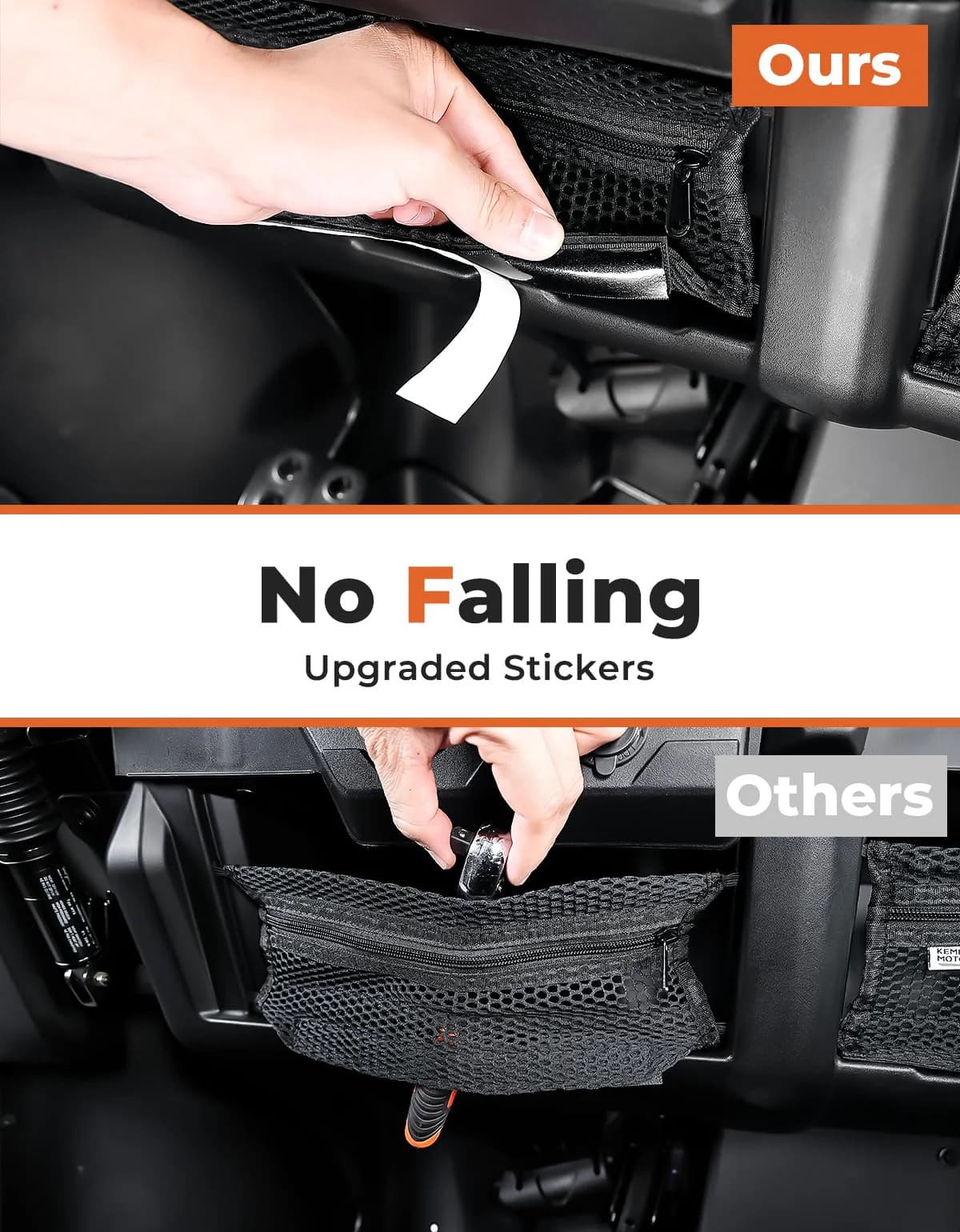 Upgrade your Can-Am Defender / MAX with Kemimoto dash storage net. Keep your items secure with extra bottom stickers, even on bumpy trails. Access your stuff easily—reach through the net or unzip from the center. Made of tough nylon, it won't break like plastic or leather. We've also made installation a breeze by adjusting the tab width based on customer feedback. Perfect fit, easy install, and superior quality—get yours now!
