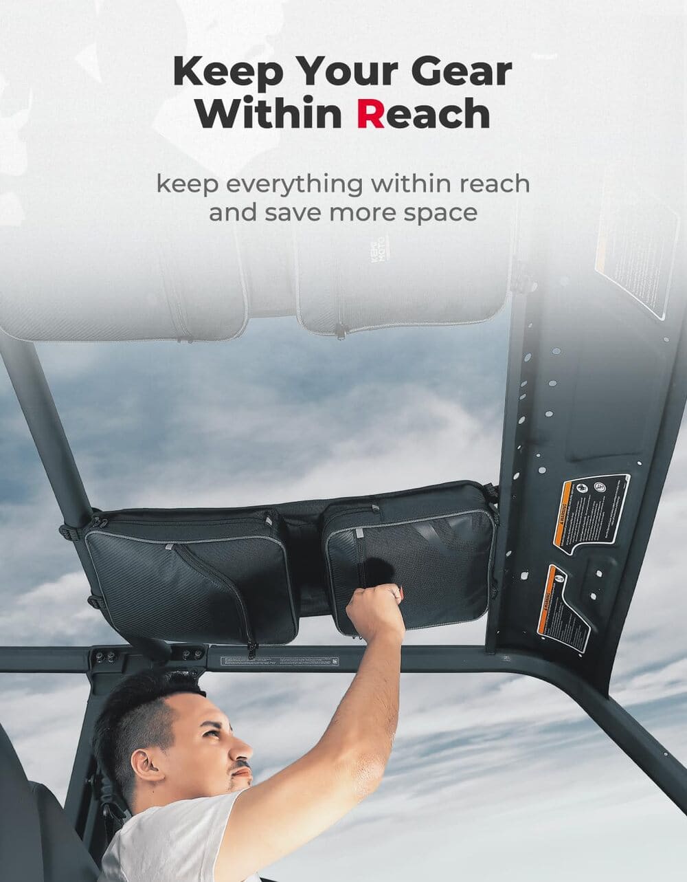 - Great Material: H10 Overhead storage bag is made of 1680D high quality nylon material that is water repellent, anti-scratch. With the PVC back and rustproof zippers, the roof bag can effectively prevent sand, water, dirt, etc. from getting into the storage bag.