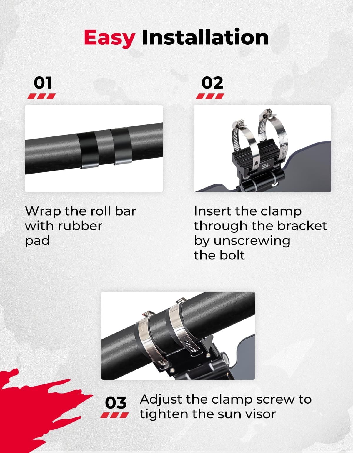 - Easy Installation: Insert the mounting clamp through the upper part of the connector, then secure the mounting clamp onto the round roll bars of your UTV. Next, install the sun visor onto the lower part of the connector. The package includes mounting hardware and a pad to protect your roll bar from scratches