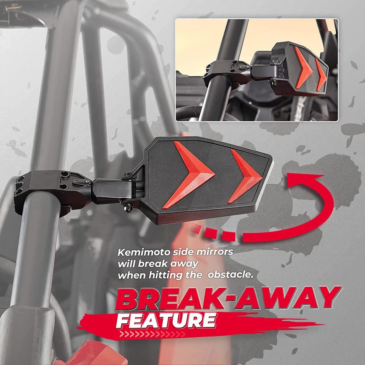 Break Away Feature: KEMIMOTO utv side mirrors can be adjustable 180 degree and fold back when the rearview mirror hits a tree or obstacle, reducing the risk of smash.