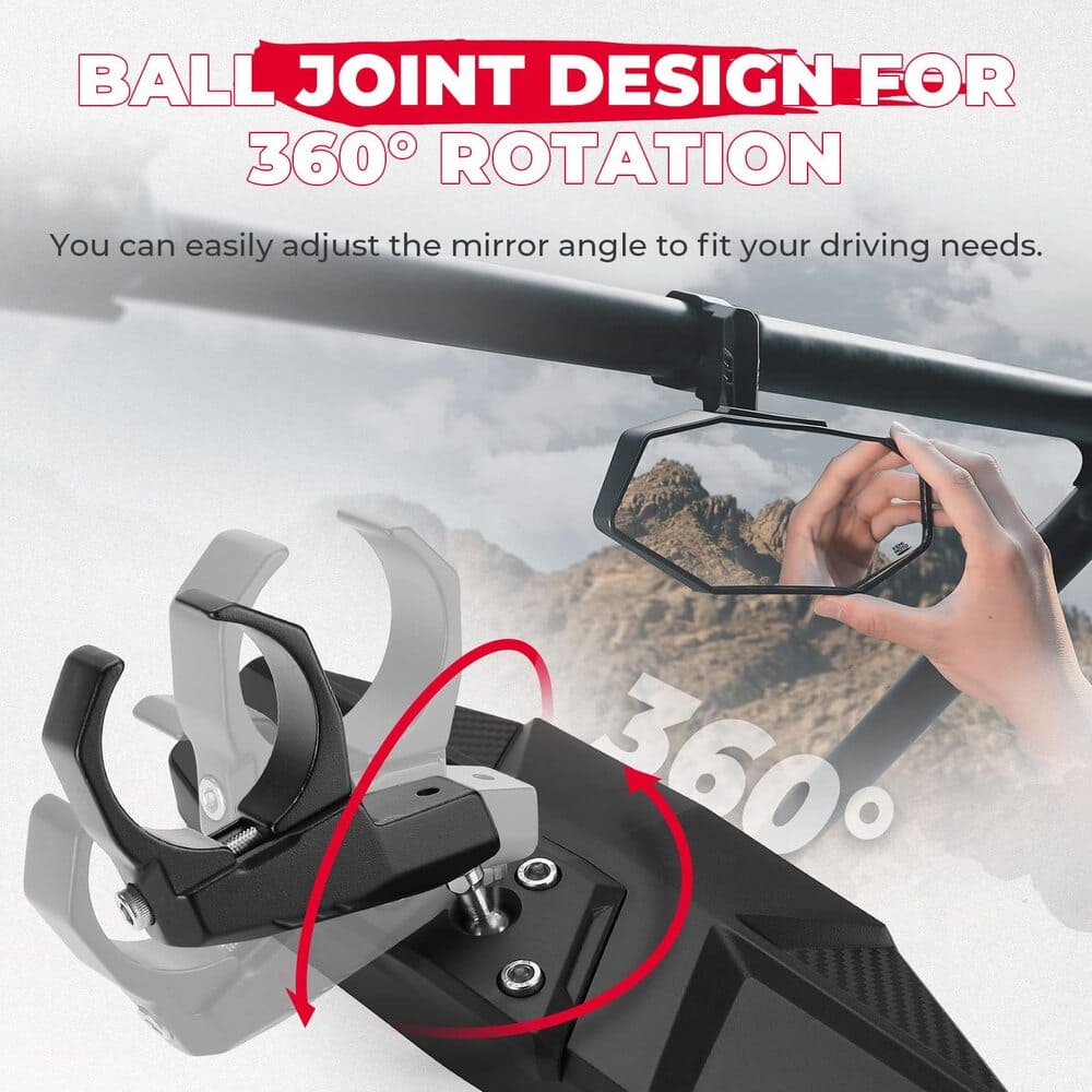 - 360 Degrees Adjustment: UTV center rearview mirror with 360 Degrees adjustable ball pivot, makes it easier to adjust the angle of rear view mirror for you need. Kemimoto utv mirrors with non-slip tape can hold the mirror more stable, ensures the UTV mirror always keep stable to the roll bar cage in off-road adventures.