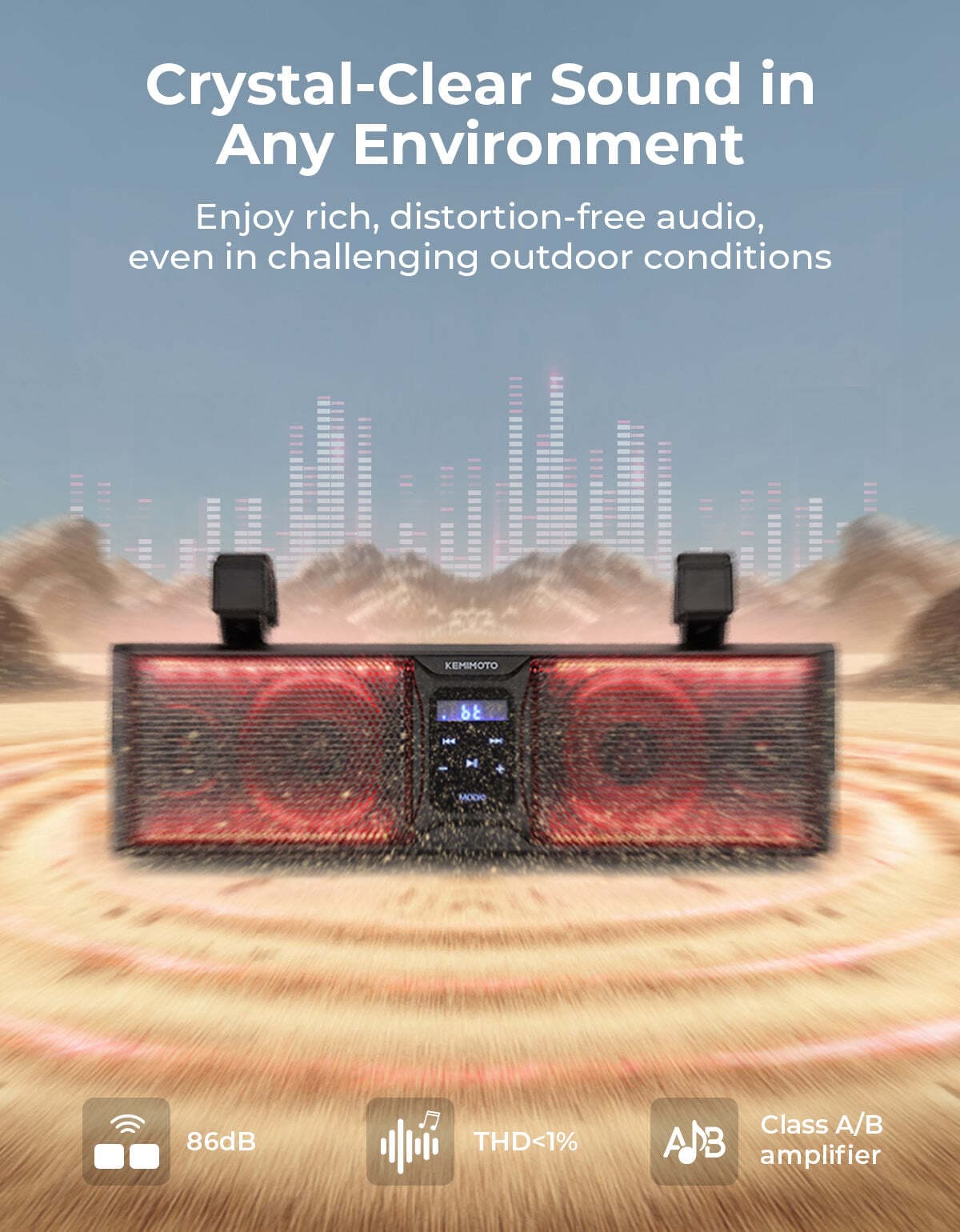 Waterproof & Dustproof: KEMIMOTO SXS Sound Bar is compliant with IP65 Rating International Standard. Offering Complete protection from dust, oil, and other non-corrosive material, and a good level of protection against water.