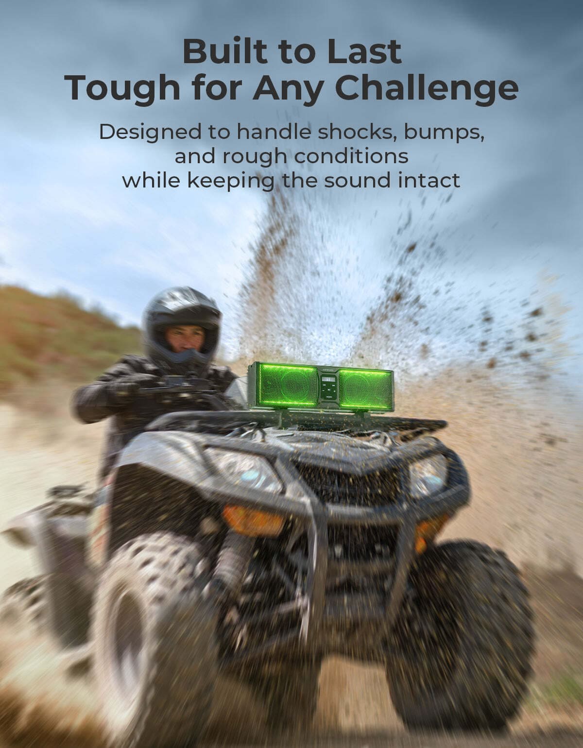The Kemimoto RGB universal sound bar transforms your ride with vibrant multi-color lights that sync to your music. Designed for all-weather durability with an IP65 waterproof and dustproof rating, it delivers powerful audio through two 4'' full-range speakers and two 1'' soft dome tweeters, powered by a built-in Class A/B amplifier. This sound bar is perfect for ATVs, UTV, golf carts, and more.