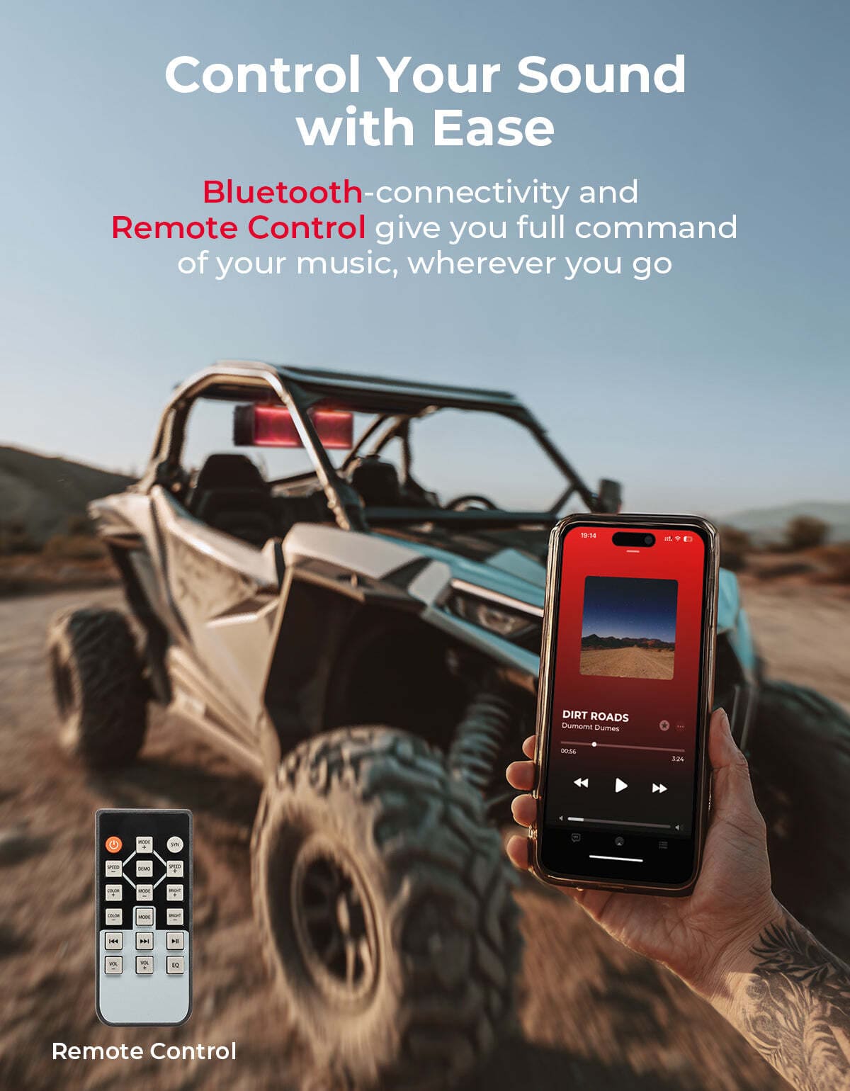 - Multiple Input Options: KEMIMOTO utv sound bar is compatible Bluetooth V5.0 Audio Streaming - play and control music and apps wirelessly. USB Audio play and 3.5mm Aux Input Compatible with Audio Output of Smartphones and MP3 Players. KEMIMOTO UTV speakers can connect 12V power by plugging in the cigarette lighter power cord.