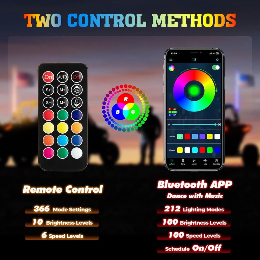 APP Control: Kemimoto atv whip lights can be controlled by Bluetooth or RF remote control. With the smartphone APP, there are 212 light modes settings, music sync mode, schedule timing function, 100 light speed adjustable levels, and 100 light brightness adjustable levels. With RF remote control, lighted whips for UTV have 366 light modes, 10 solid colors modes, 6-speed adjustable levels, and 10 brightness adjustable levels.