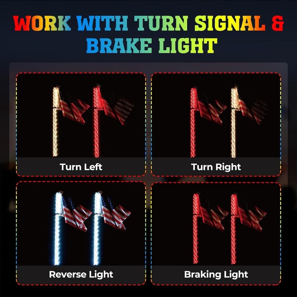 - Turning signal & Brake light: Kemimoto Bluetooth-controlled led whip lights for utv can be connected to taillights and turn signals for brake light and turn signal functions. Please refer to the manual for specific wiring connections.