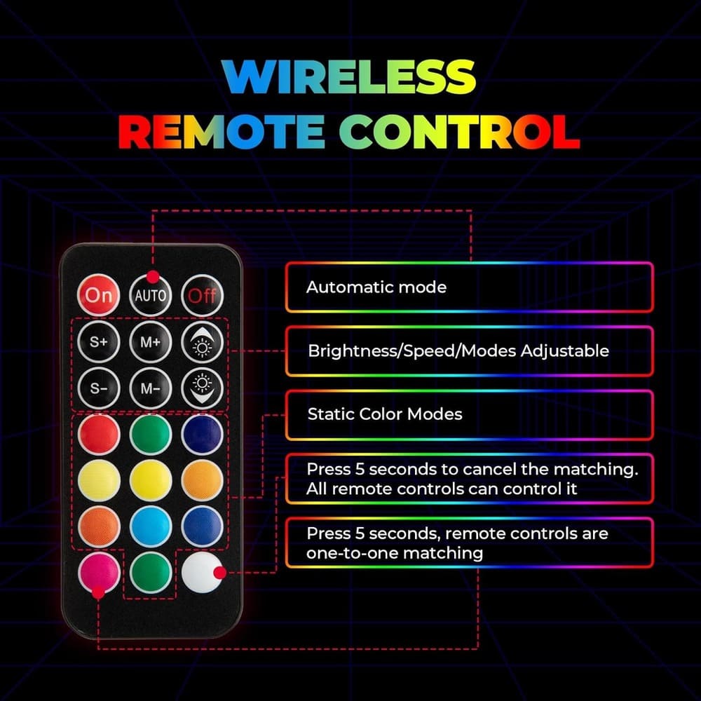 - Lighting modes: 366 modes with remote control. 178 modes setting