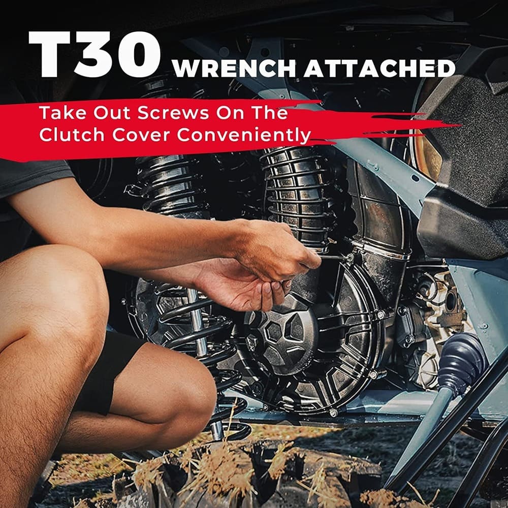 The package of KEMIMOTO x3 belt tool kit includes one clutch release tool, one M10x60 screw and one T30 torx wrench. This x3 clutch removal kit is upgraded version with t30 wrench to help you remove the cluth cover, it isn't necessary for you to look for screwdriver anymore.