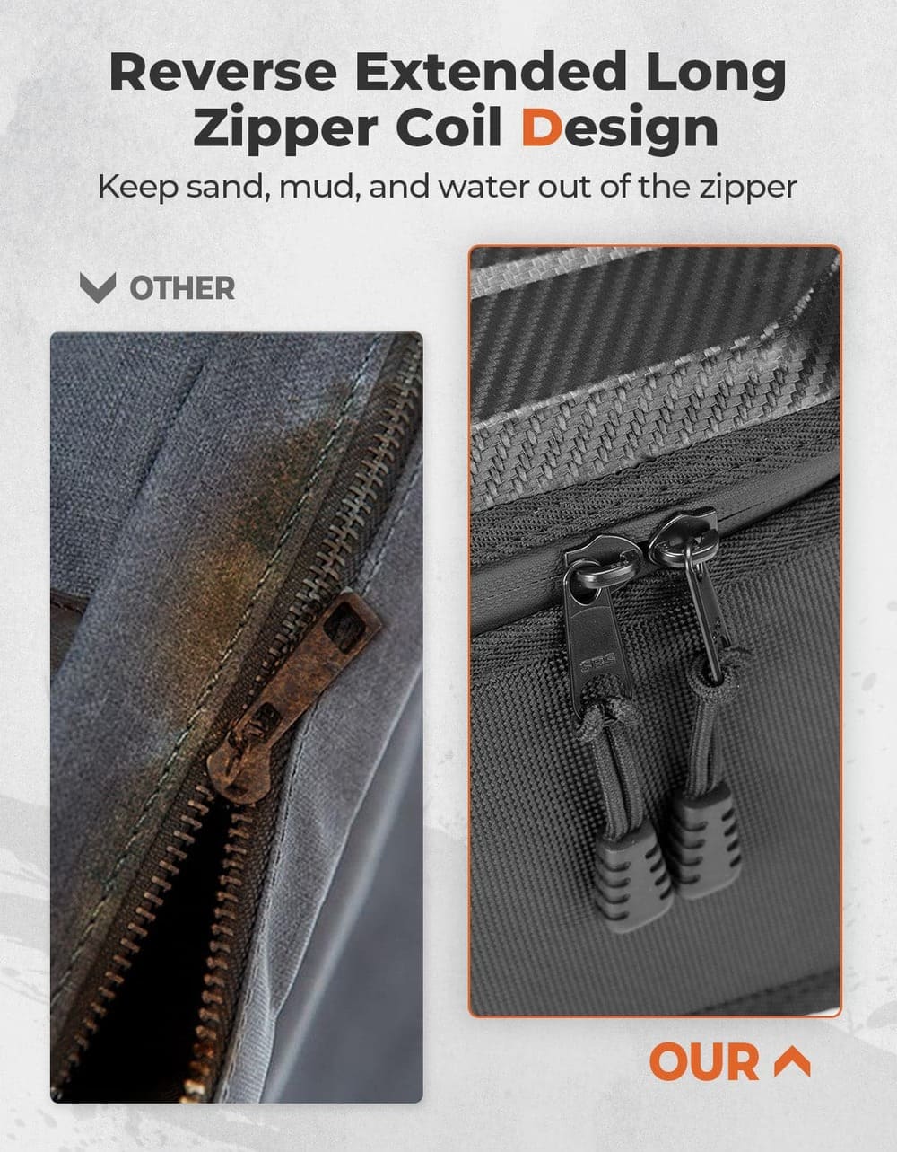 - Zipper design: The double-ended waterproof zipper design blocks mud, sand, and water while allowing easy access to using the middle bag for both driver and passenger. The extended zipper pull enables effortless use, even with gloves.