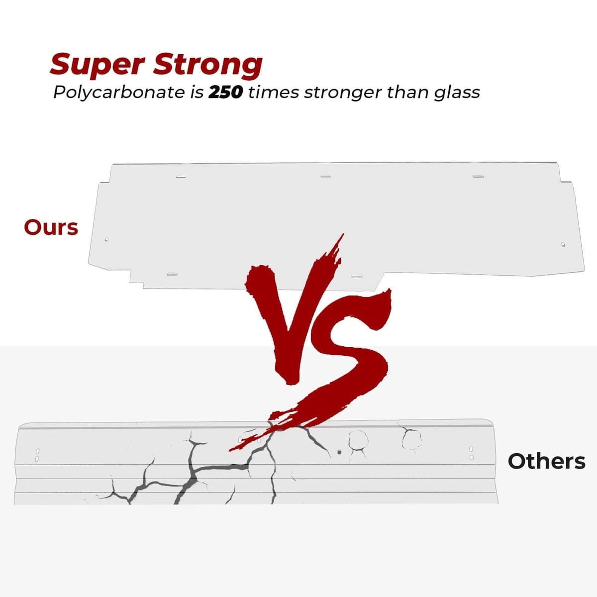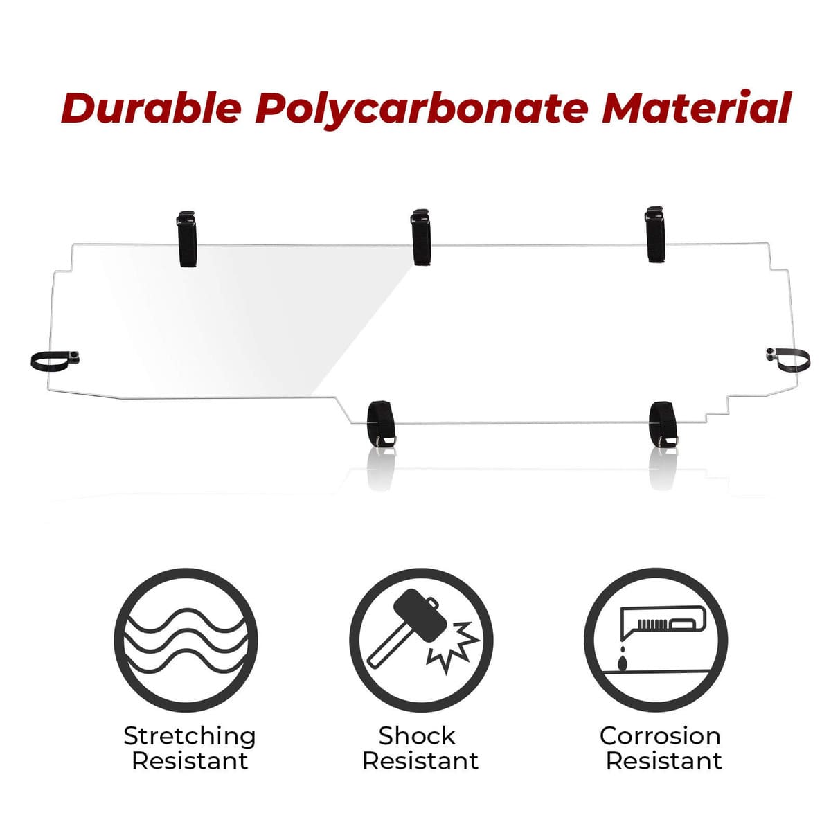 KEMIMOTO x3 back windshield is made of 1/4 inch thick polycarbonates, which is 250 times stronger than glass, no more worrying about cracking or breaking down during driving. With UV-resistant layer, x3 back windshield is more antioxidant.