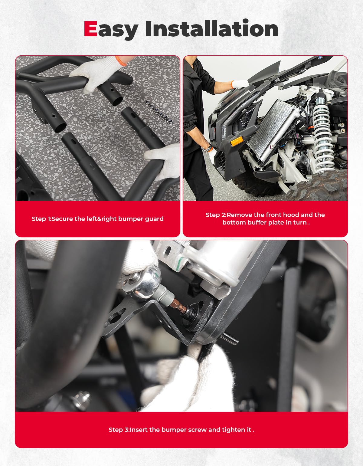 Easy Installation: Step 1 Attach the bumper guards and the connecting pipe together;Step 2:Remove the front hood and the bottom buffer plate in turn;Step 3:Insert the bumper screw and tighten it.Please check the documentation for more installation details.