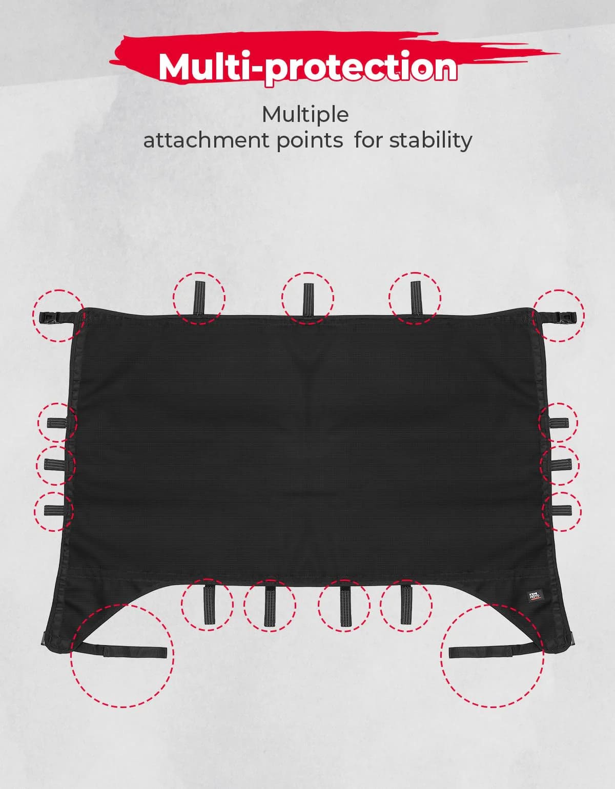 - Easy Installation: There are multiple attachment points of kemimoto x3 soft roof top for stability,no drilling required, fasten to the roof frame with straps and clips,done